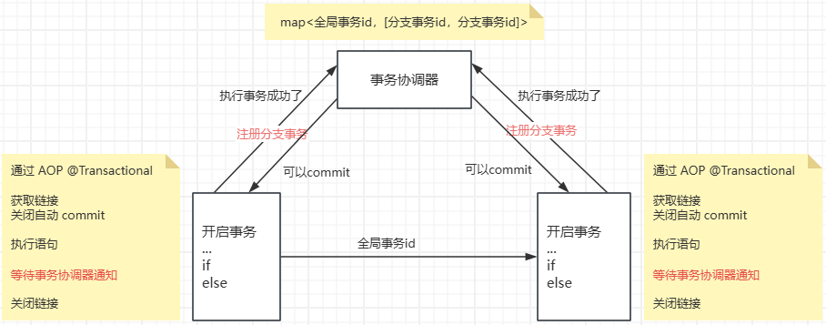 引入了事务协调器,来服务通知大家,是否可以进行最后的 commit。