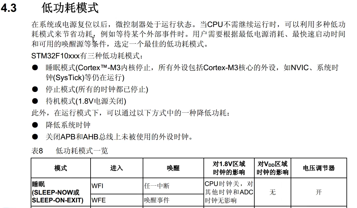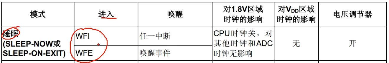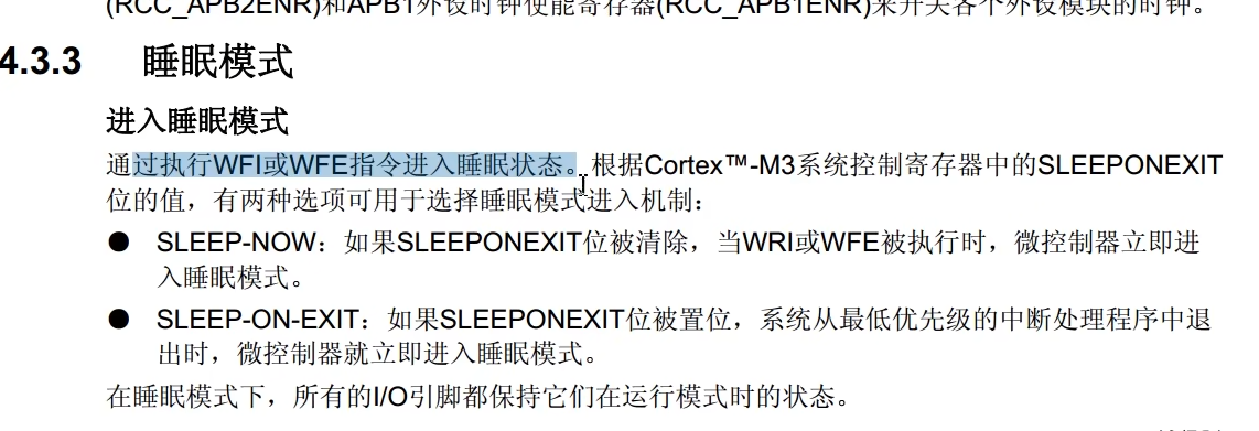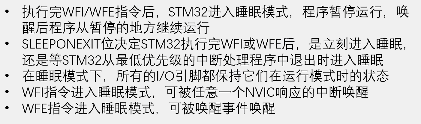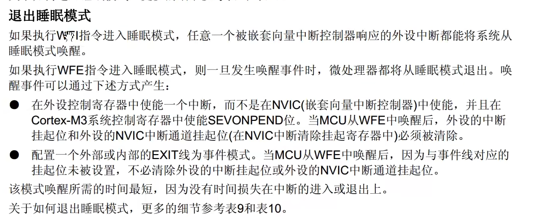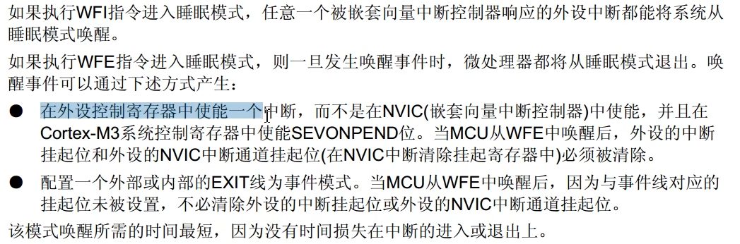 如何进入呢,这里写了,直接调用WFI或者WFE,即可进入。这两个东西是内核的指令。对应库函数里也有对应的函数。直接调用函数即可,其中WFI的意思是Wait ForInterrupt,等待中断。意思就是先睡眠,如果有中断发生的话,再叫我起来,所以对应的唤醒条件就是任意中断。任何外设的任何中断发生时芯片都会醒来,所以醒来之后的第一件事就是处理中断。