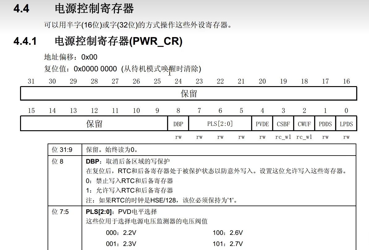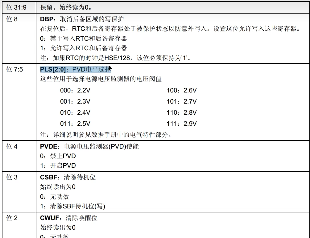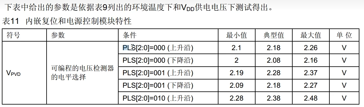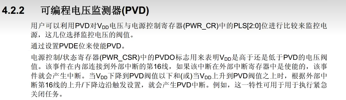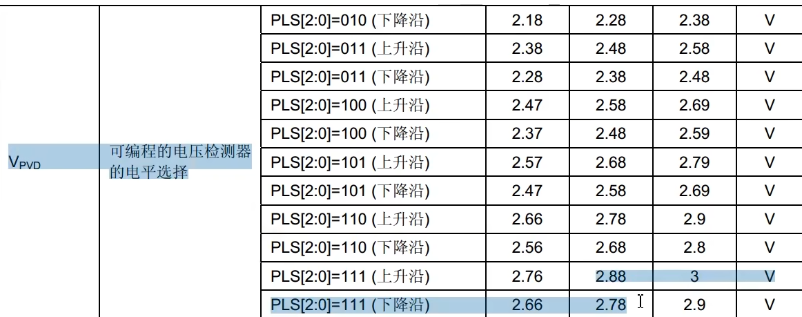 可编程电压检测器简称PVD。他的工作流程和上面差不多。都是检测VDD和VDDA的供电电压。但是PVD的区别就是,首先他这个阈值电压是可以使用程序指定的。调节的范围可以看一下数据手册。