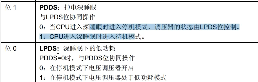 首先,SLEEPDEEP设置为就是告诉CPU你可以深度睡眠了。PDDS这一位用来区分是停机模式还是待机模式。PDDS=0进入停机模式,PDDS=1进入待机模式。所以想要进入停机模式PDDS要预先设置为0。LPDS用来设置电压调节器。开启或者进入低功耗模式。LPDS=0电压调节器开启,LPDS=1电压调节器进入低功耗。