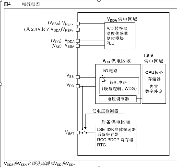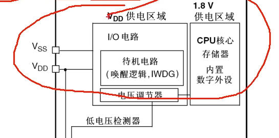 这一部分有两个部分组成,一个是VDD供电区域,其中包括了I/O电路,待机电路,唤醒逻辑和独立看门狗,右边是VDD通过电压调节器,降低到1.8V,提供给后面的1.8V供电区域。