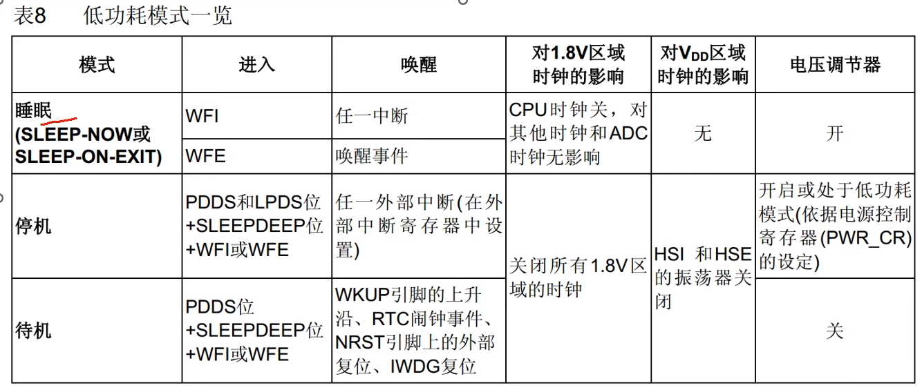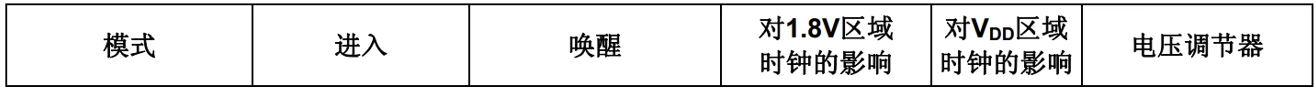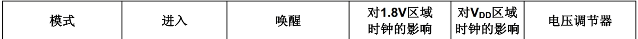 第一列就是有哪几种模式。第二列是如何配置才能进入我们想要的模式。第三列是进入这些模式之后如何进行唤醒。最后三列是每种模式对电路的操作。关闭了那些东西,就是那些电路就不能用了保留了那些东西,就是那些电路可以工作。