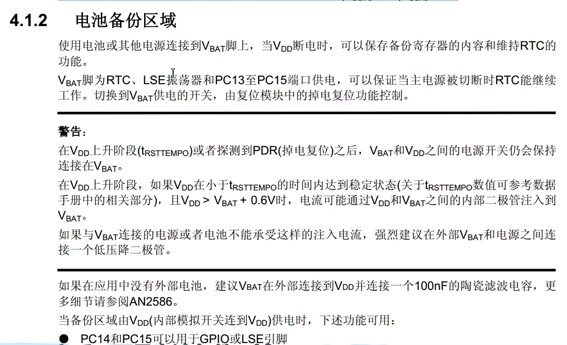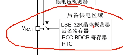 RTC BDCR是RCC的寄存器叫备份域控制寄存器,也是和后备域有关的寄存器所以也可以由VBAT供电。然后这里有个低电压检测器,可以控制前面的开关。VDD有电时由VDD供电,VDD没电时候,由VBAT供电。