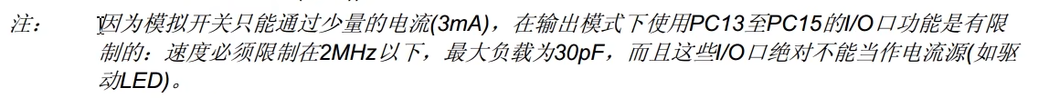 还有一个注,是需要注意的。这里特别提示了PC13和PC15端口绝对不能驱动LED。但是我们最小系统板,有两个LED,一个是电源指示灯,一个是接在GPIO口的测试灯。并且接在GPIO口的测试灯,正好接在PC13口。所以说这个STM32的最小系统设计违背了这一注意事项,不过好在,贴片LED的电流要求不大,目前没有什么问题。