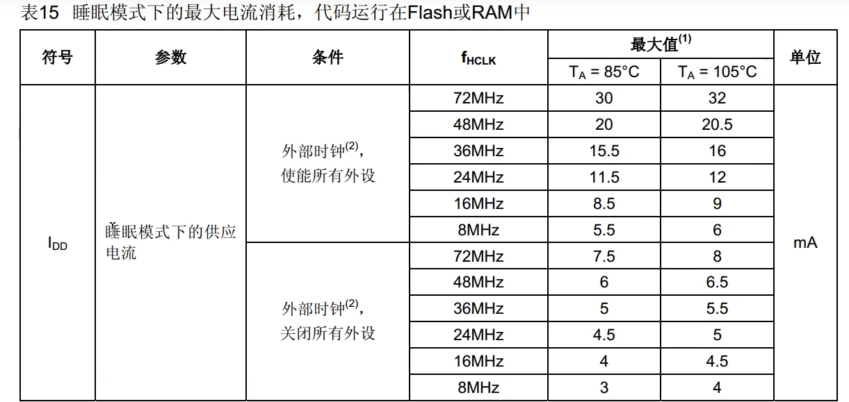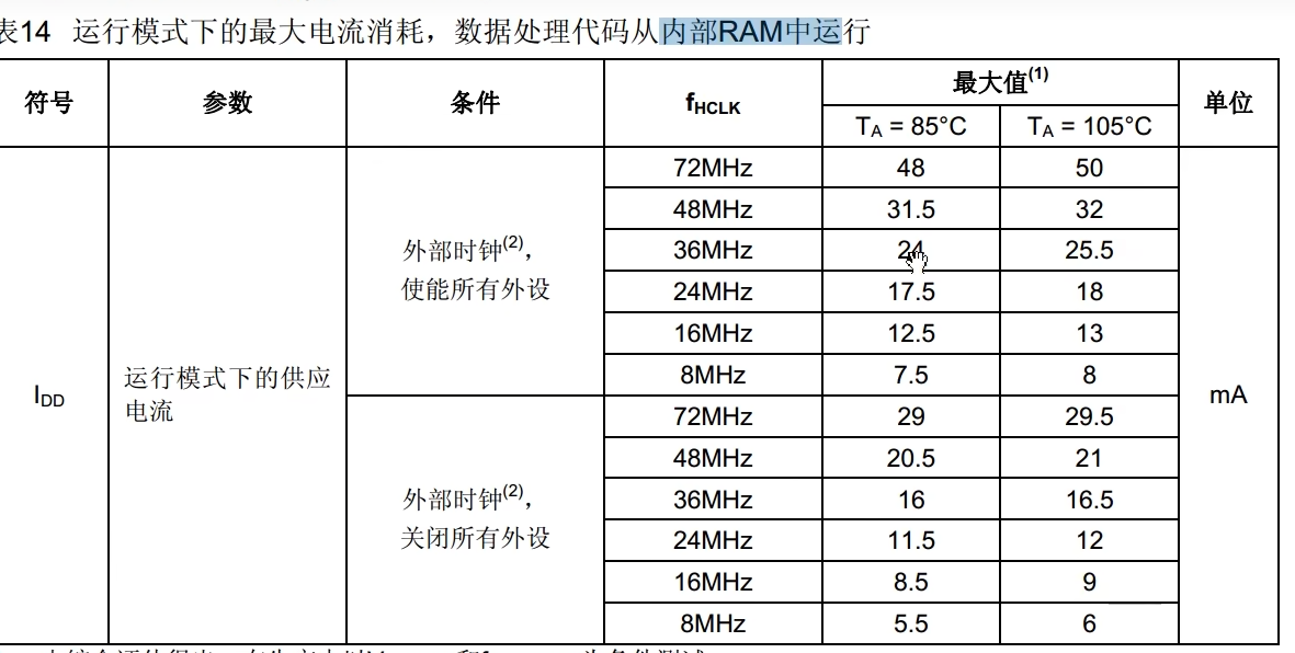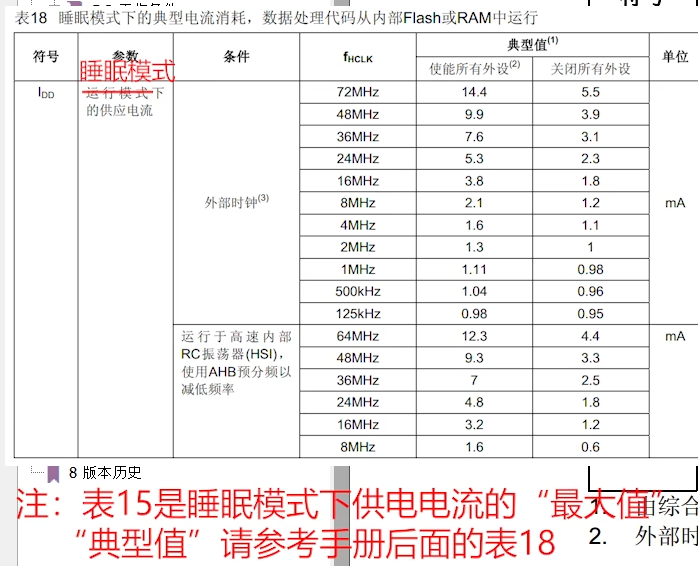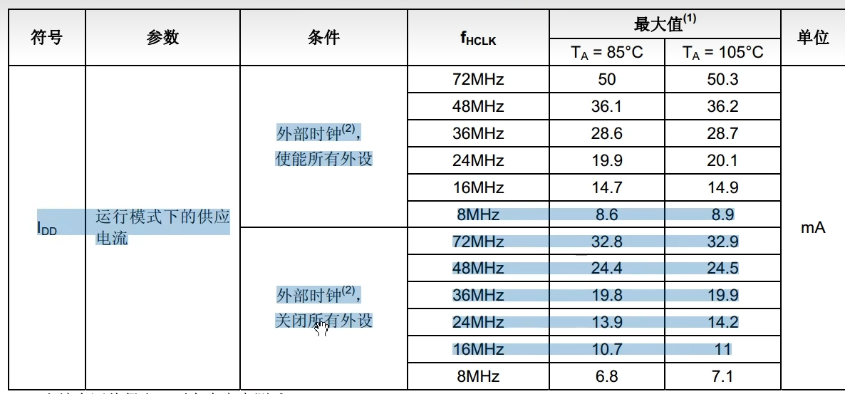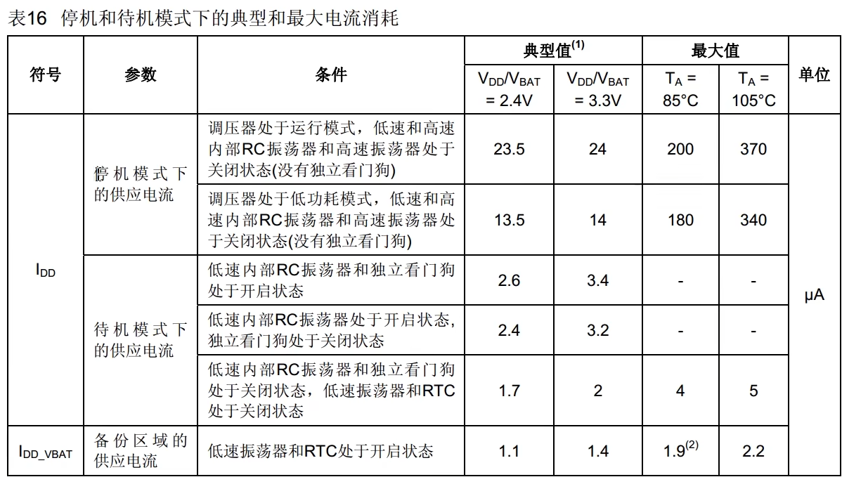 停机模式下的供应电流和待机模式下的供应电流,可以看到相当省电了。这个电流的单位是uA级别,正常模式和睡眠模式的电流都是mA级别。举个例子,比如有一个300mA的电池,然后正常模式是30mA可以用10小时,停机模式电流是30uA能用10000小时,待机模式电流是3uA能用100000个小时。