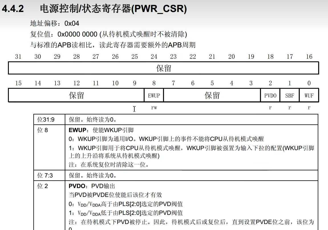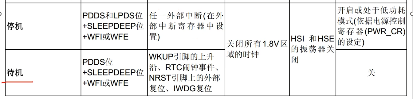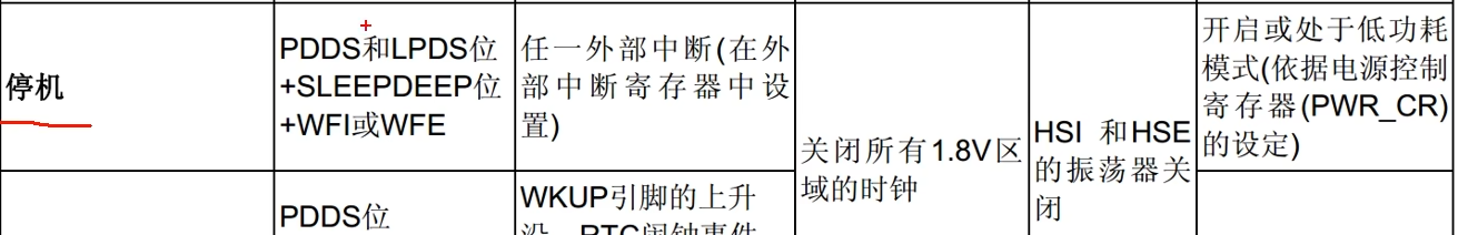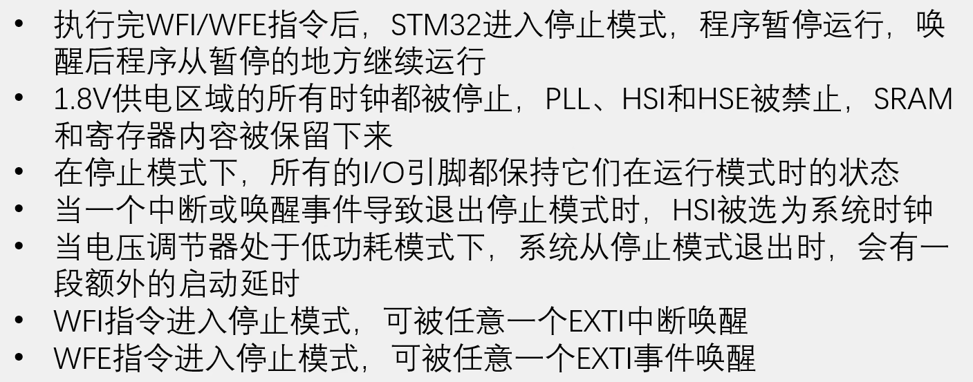 因为这个模式下,芯片睡得更深。关的东西更多,所以唤醒条件就苛刻一些。是任一外部中断,刚刚我们提到的PVD,RTC闹钟,USB唤醒,ETH唤醒,借到了外部中断,所以这四个信号也可以唤醒停止模式。另外这里并没有区分WFI和WFE。也可以想象的到,WFI要用外部中断的中段模式唤醒,WFE要用外部中断的事件模式唤醒。