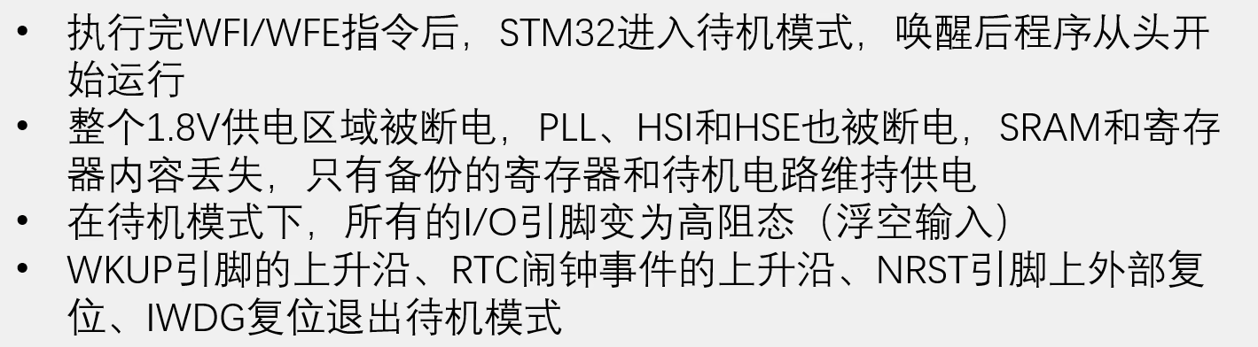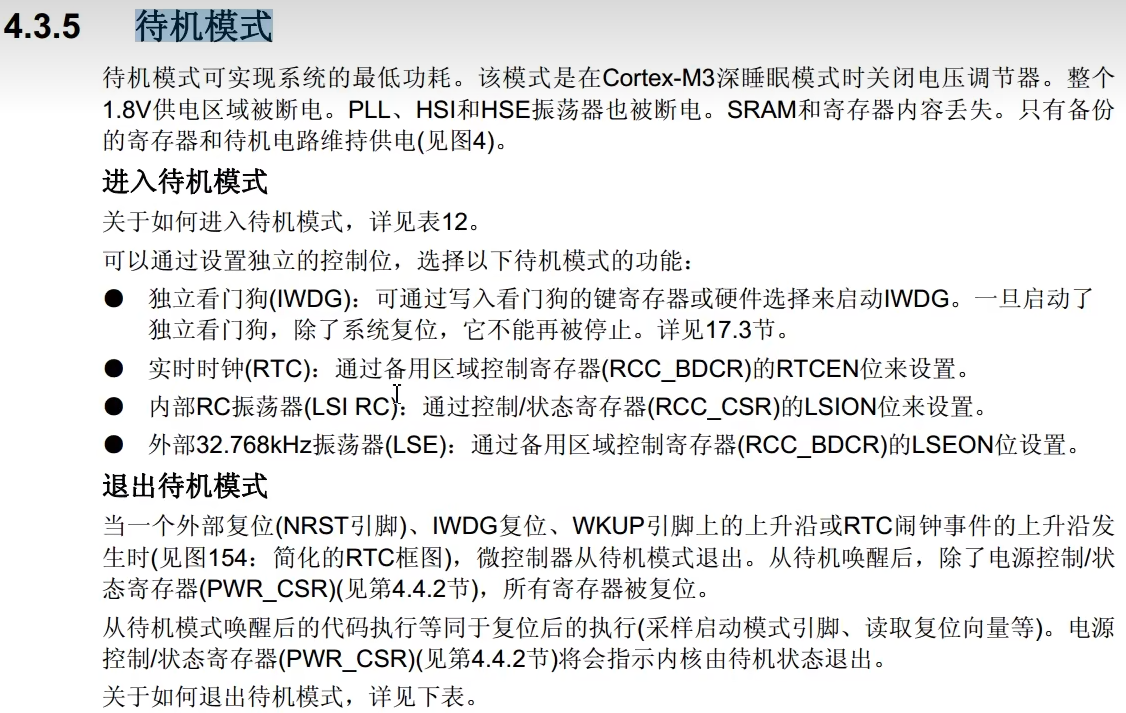第一条,待机模式唤醒,程序是从新开始执行。因为待机模式把内部的电源大部分都断了,数据也消失了,所以需要从头开启。