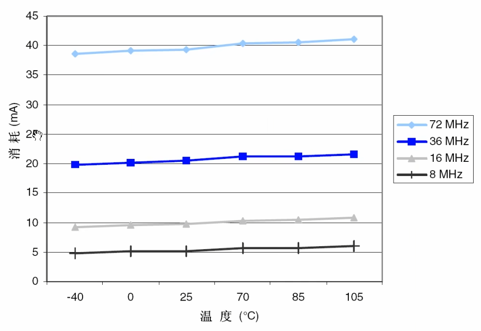 正常模式下的电流。可以看到降低主频是非常省电的,如果对频率要求不高,可以适当降低主频。
