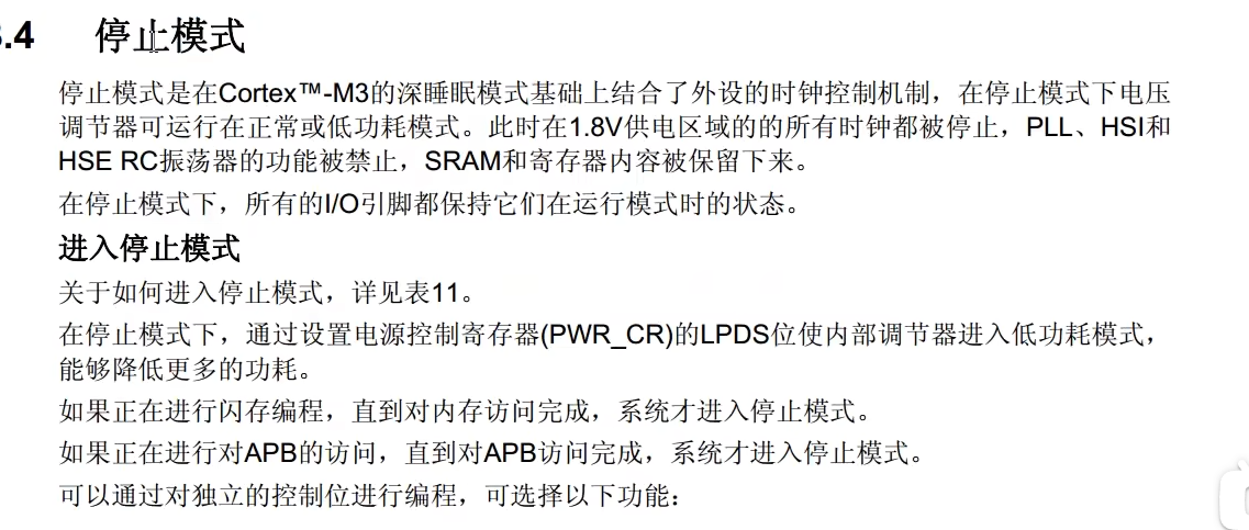 第二条,CPU和外设的时钟都停止,但是没有断电,SRAM和寄存器的数据还可以维持。