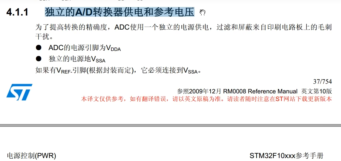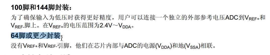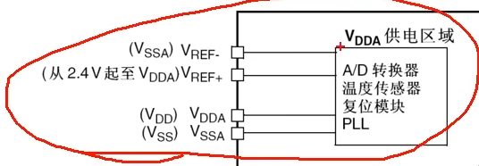 这其中PLL是锁相环。VDDA是供电正极,VSSA是供电负极。其中A/D转换器还有两根参考电压的供电引脚VREF+,VREF-。这两个引脚会在引脚多的时候单独印出来,但是我们的C8T6中VREF+,VREF-在内部就接到了VDDA和VSSA中了。
