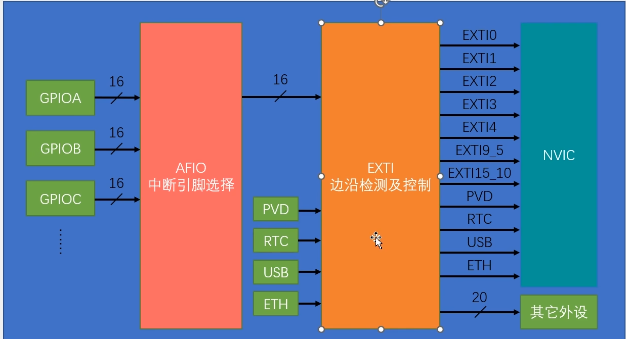 我们可以看一下外部中断这个图,发现PVD中断在这里,所以我们要使用中断的话,记得配置一下外部中断。