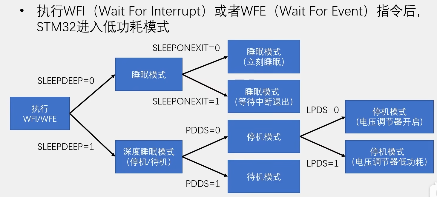 WFI和WFE这两条指令是触发STM32低功耗模式的触发条件。配置其他的寄存器要在这两个指令之前。一旦WFI或者WFE执行了,系统怎么判断是哪个模式呢。