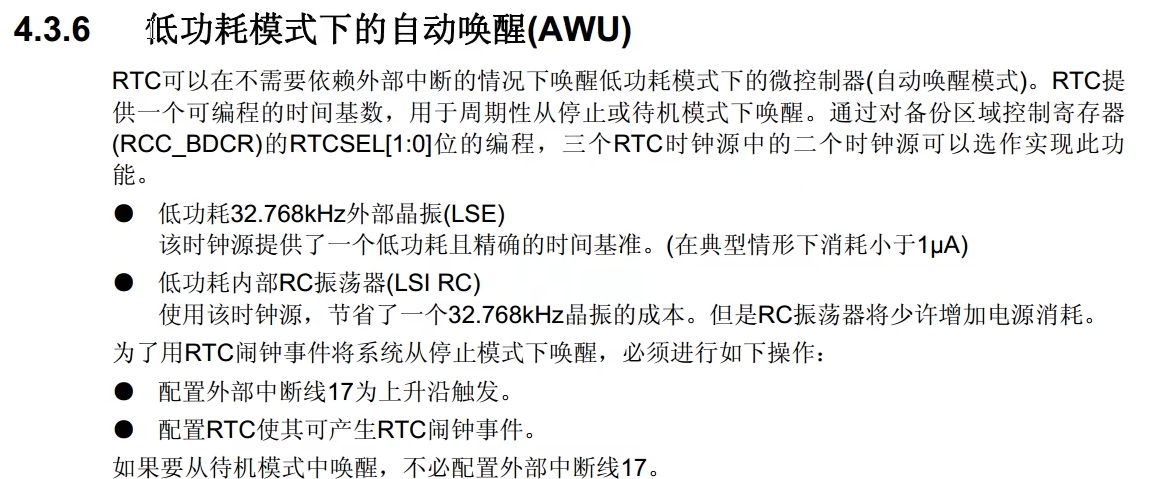 之后是低功耗下自动唤醒。这里的意思就是使用RTC可以在停止模式或者待机模式下,定期唤醒芯片。