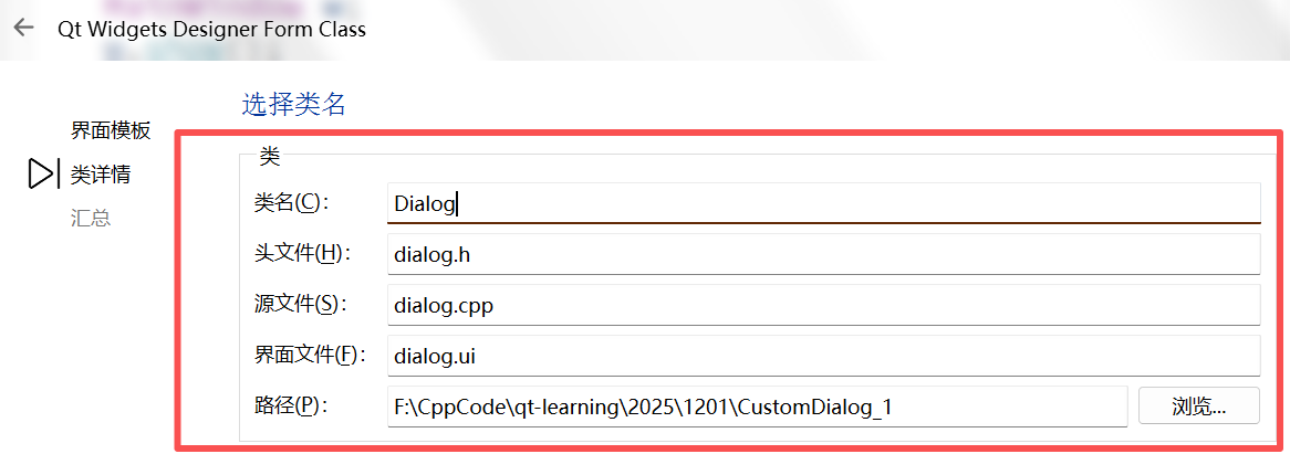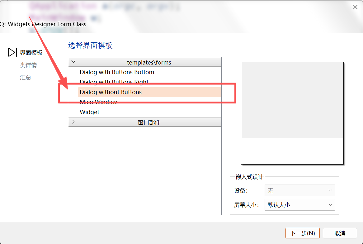 QDialog的派生类, 因此此处选择Dialog Without Buttons)