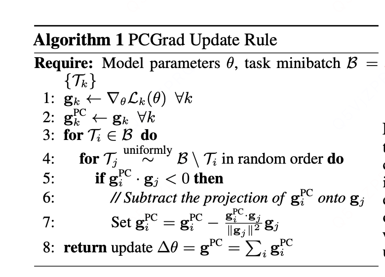 PCGrad 会按以下方式完成所有任务的梯度修正,确保批次内任务间的梯度干扰最小化: