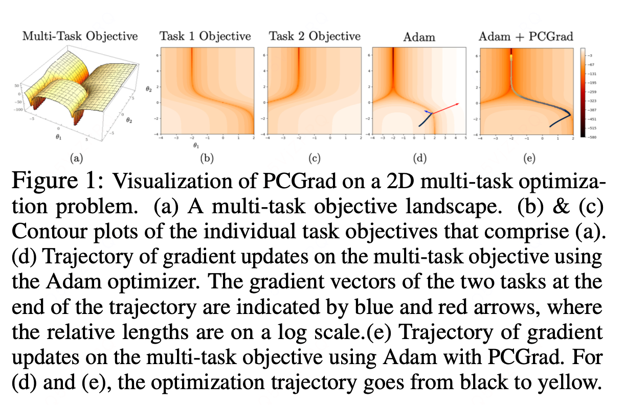在本文中,我们识别出多任务优化 landscape 中导致有害梯度干扰 的三个关键条件,并提出一种简单且通用的方法来避免任务梯度间的此类干扰。我们设计了一种梯度修正策略 :对于存在梯度冲突的任意两个任务,将其中一个任务的梯度投影到另一个任务梯度的法平面上。在一系列具有挑战性的多任务监督学习和多任务强化学习问题中,该方法显著提升了学习效率和性能。此外,该方法具有模型无关性,可与现有多任务架构结合使用,进一步提升性能。