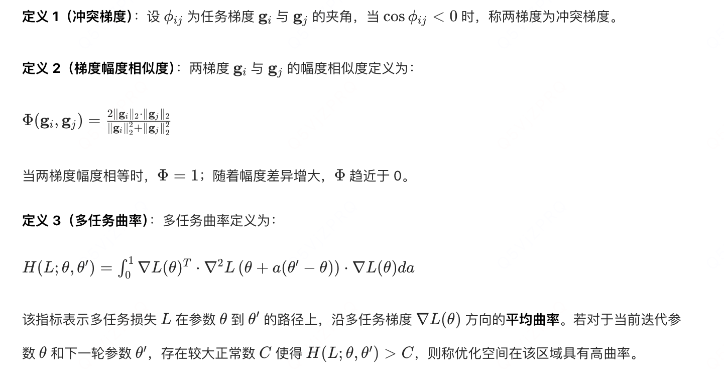 该方法的核心创新的是通过梯度投影消除冲突:对于任务 A 和任务 B,若梯度方向冲突(如夹角大于 90°),将任务 A 的梯度投影到任务 B 梯度的法平面上,得到新梯度 ------ 新梯度与任务 B 的梯度垂直,从而消除两者的冲突,让参数更新同时兼顾两个任务的优化需求。这种方式区别于 GradNorm 的 "梯度幅度调节",更侧重 "梯度方向修正",是解决梯度干扰的另一类核心思路。