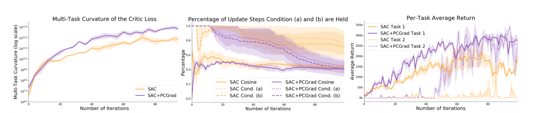 - 一旦 Adam+PCGrad 开始学会任务 2(对应右图中任务 2 的回报上升),条件(a)的满足比例立即下降 ------ 说明 PCGrad 通过消除梯度冲突(打破条件(a)),推动了任务 2 的学习进程。