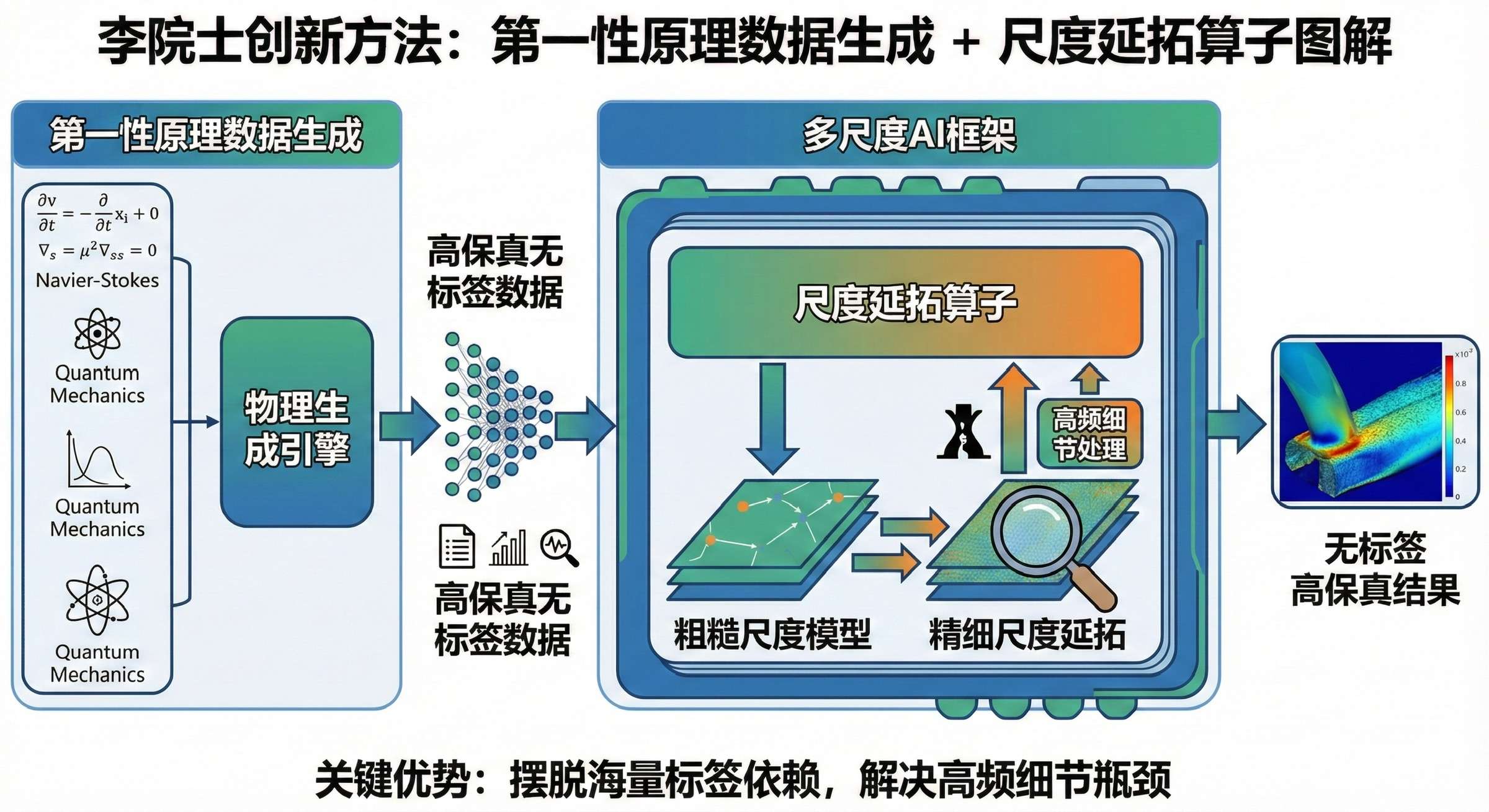 提示词:李院士在报告中提出"用第一性原理生成数据+尺度延拓算(不再依赖海量标签,也不再被高频细节卡脖子)"的创新性方法,用一张图解释上面的方法