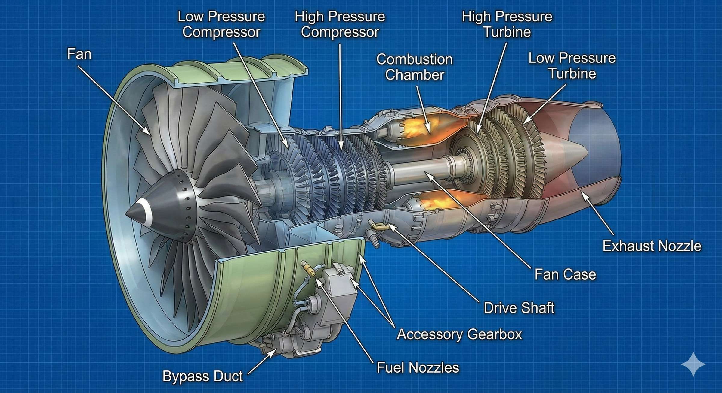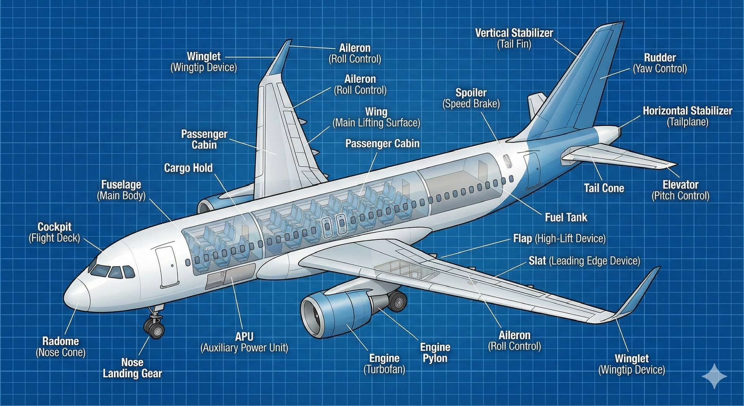 提示词:解释整架飞机的各个部位,用英文标注细节