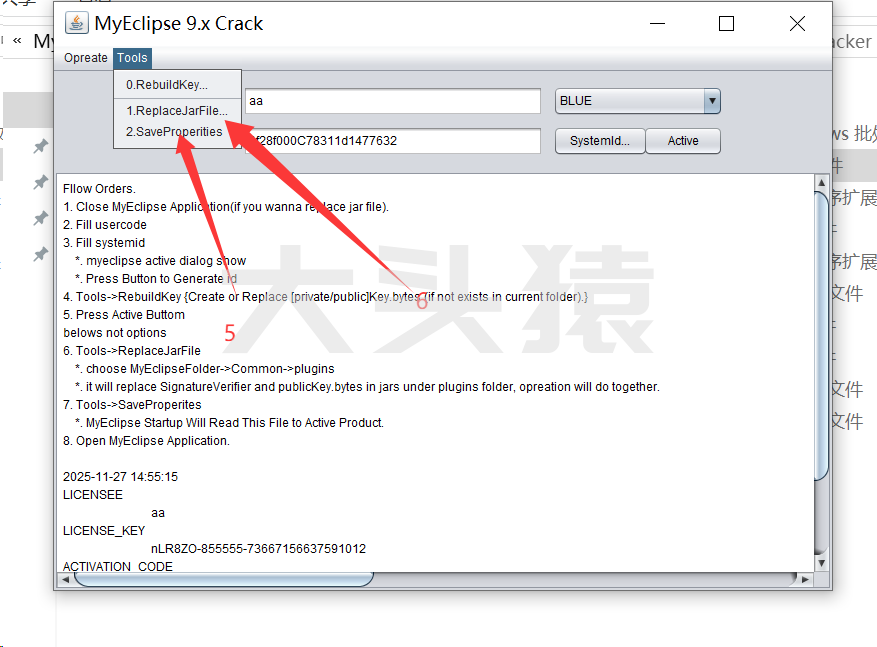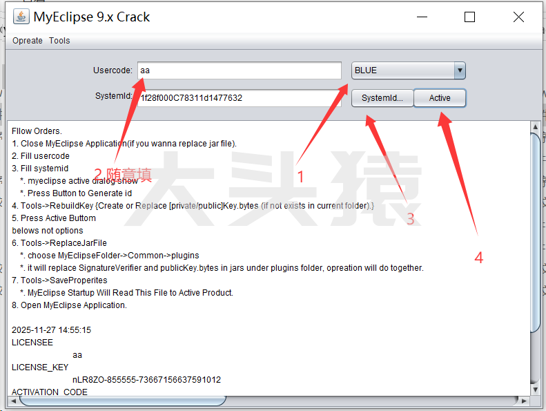 13 (1)选择"BLUE" (2)"Usercode"随便输入 (3)点击"SystemId"生成注册信息 (4)点击"Active"激活