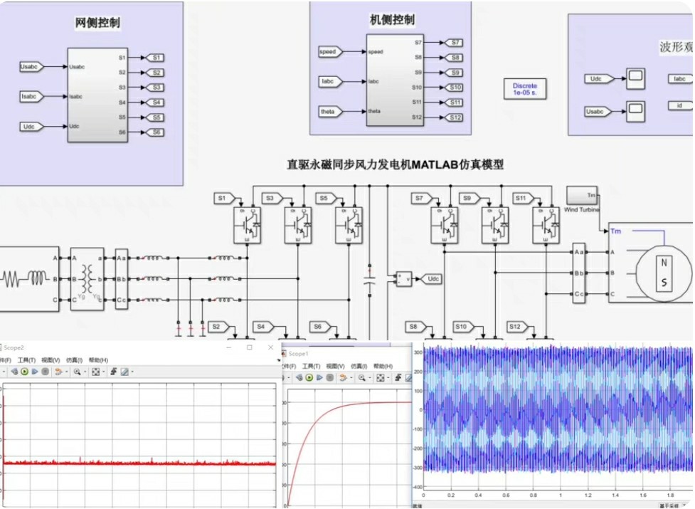最后在Simulink里拼装系统时,记得给PMSG模块的初始化参数填对磁链数。有个容易翻车的参数是极对数------曾经有个哥们把4极电机设成2极,结果转矩震荡得像蹦迪。建议先用空载状态跑,看着反电势波形对上了再加载。