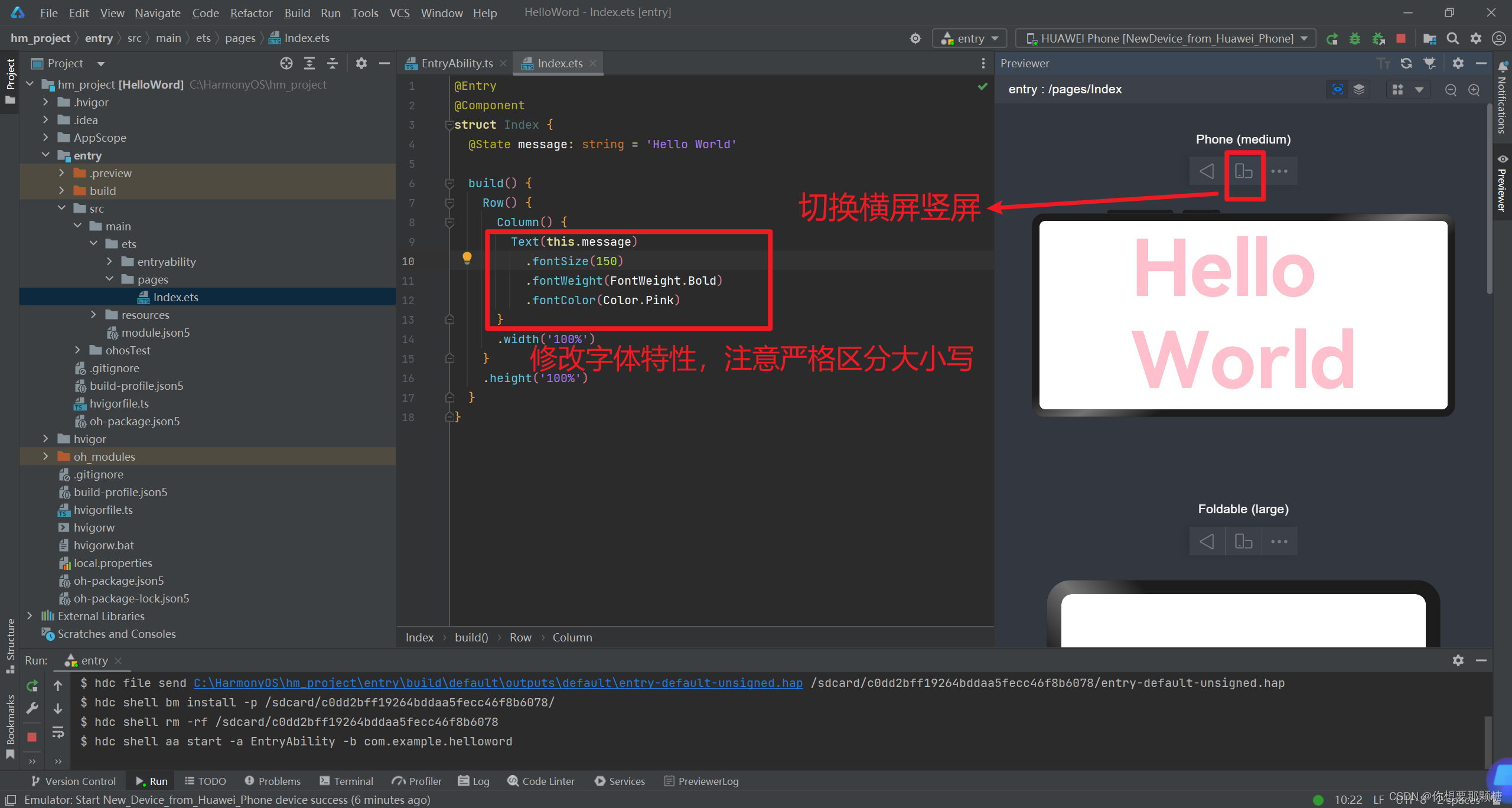 图1:DevEco Studio 中的 HelloWord 项目结构与 Index.ets 代码