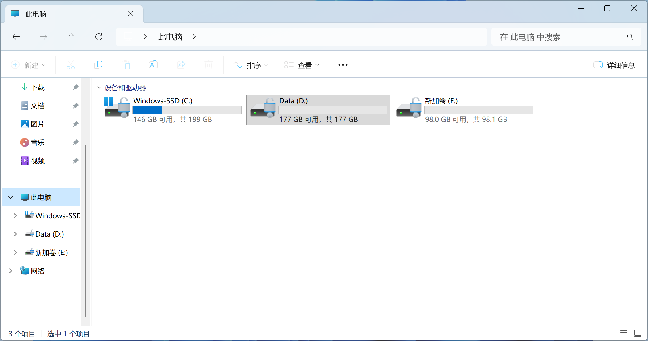 由于系统有点卡顿,加上电脑上安装的东西太多,有点不顺眼,就重装系统了。一打开磁盘,发现磁盘上锁了,专业术语就是BitLocker已加密,具体表现如下: