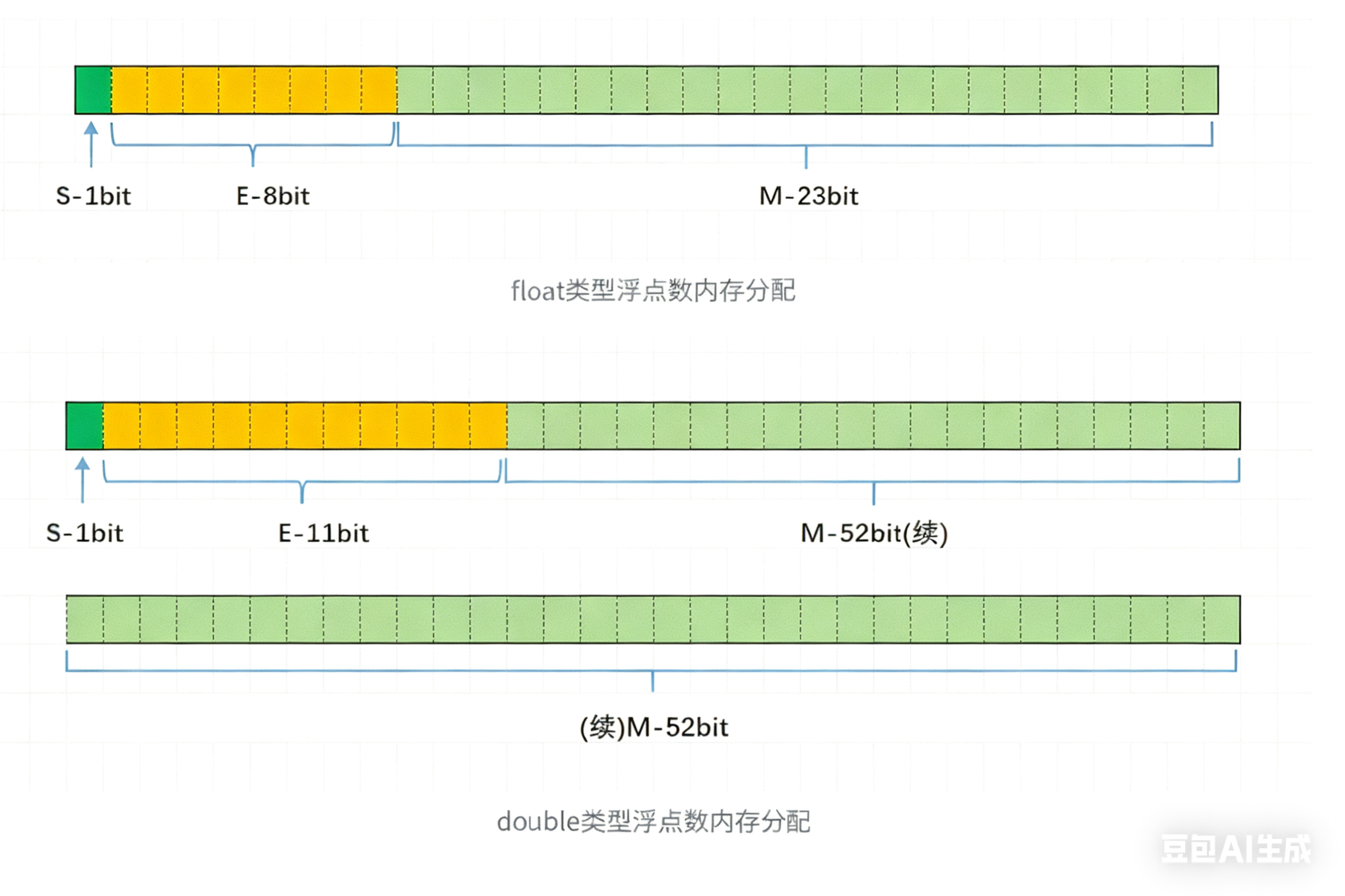 单精度浮点数(32位):1位符号 + 8位指数 + 23位尾数