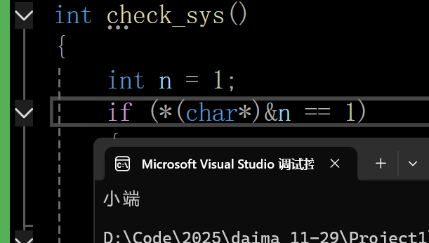 (char*)&n解引用,得到n在内存中第一个字节的值。 -