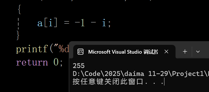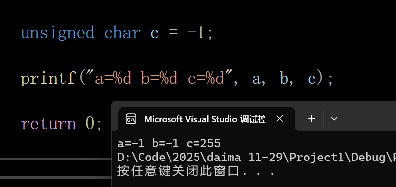 char是有符号的,那么a的二进制存储为11111111(8 位有符号数 -1 的补码)。