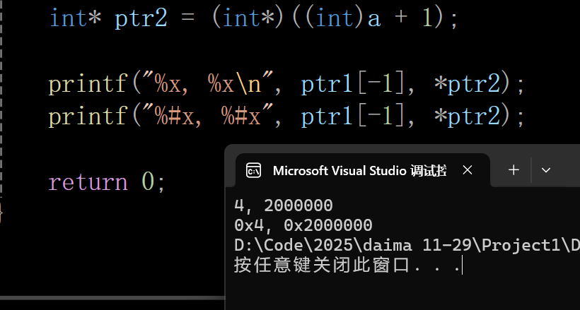ptr2从a[0]的第二个字节开始读取 4 字节 -