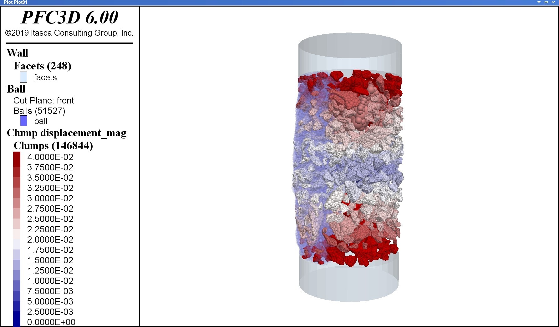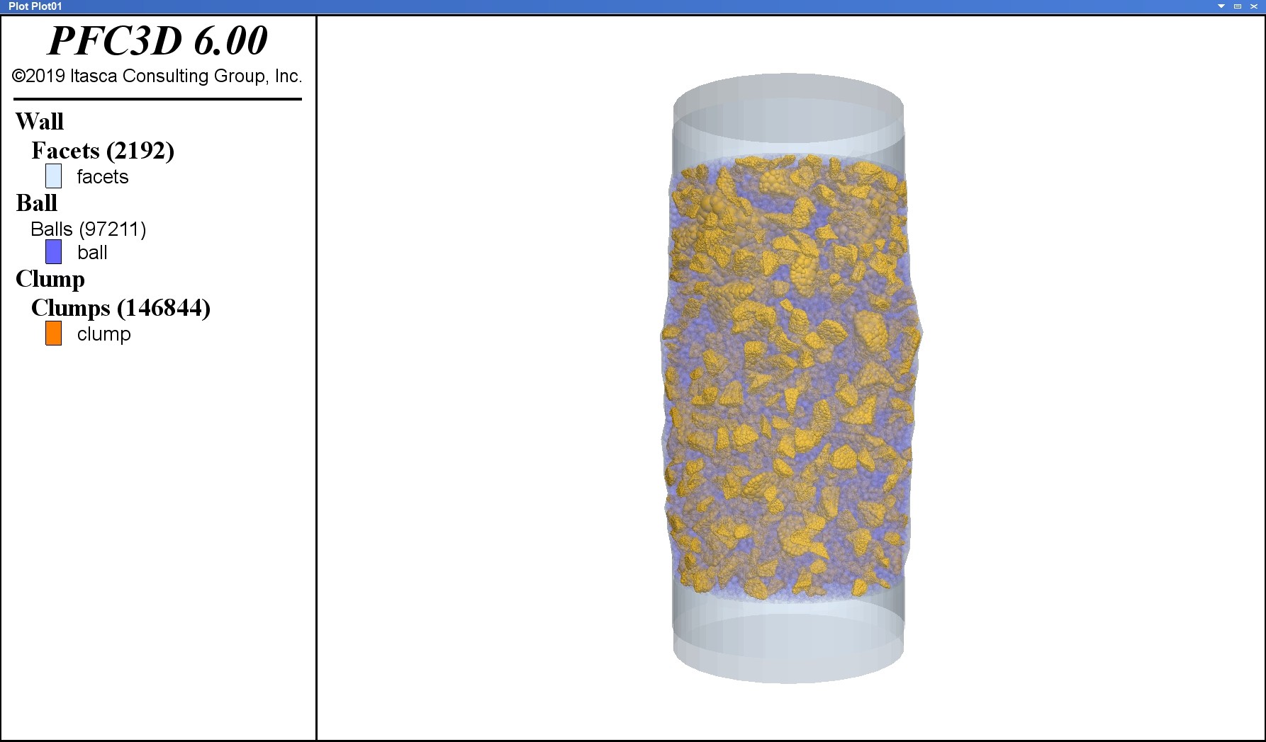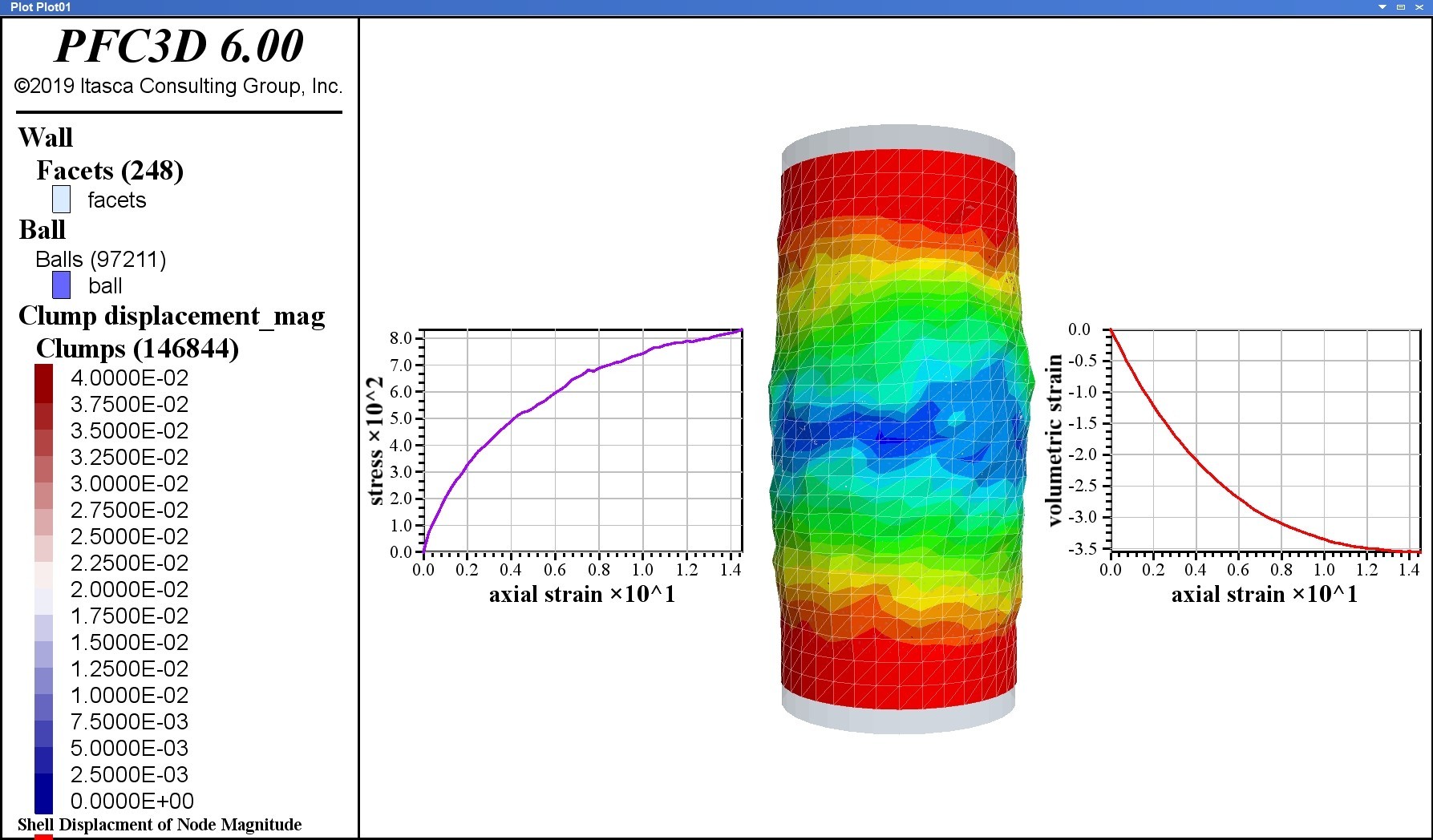 Itasca PFC6.03D 土石混合体柔性三轴试验 控制孔隙比、含石量、按级配生成试样(clump模拟块石),有一说一,三维土石混合体制样还挺麻烦 柔性三轴的体应变也可监测