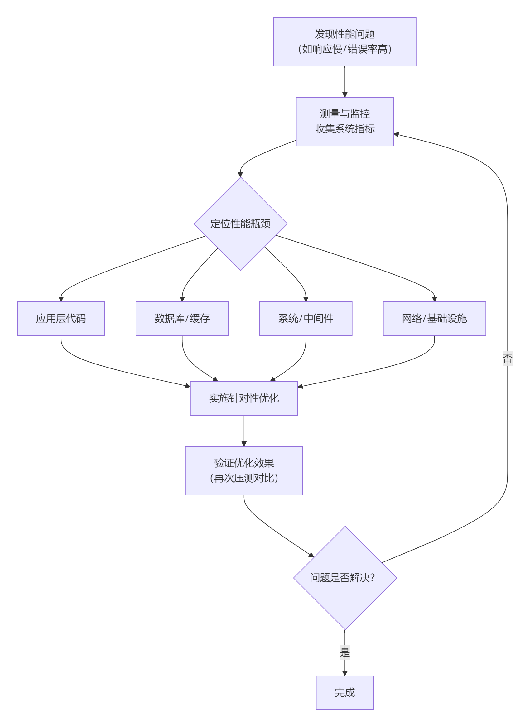 - 迭代进行:性能调优是一个"测试-定位-优化-验证"的持续循环过程。