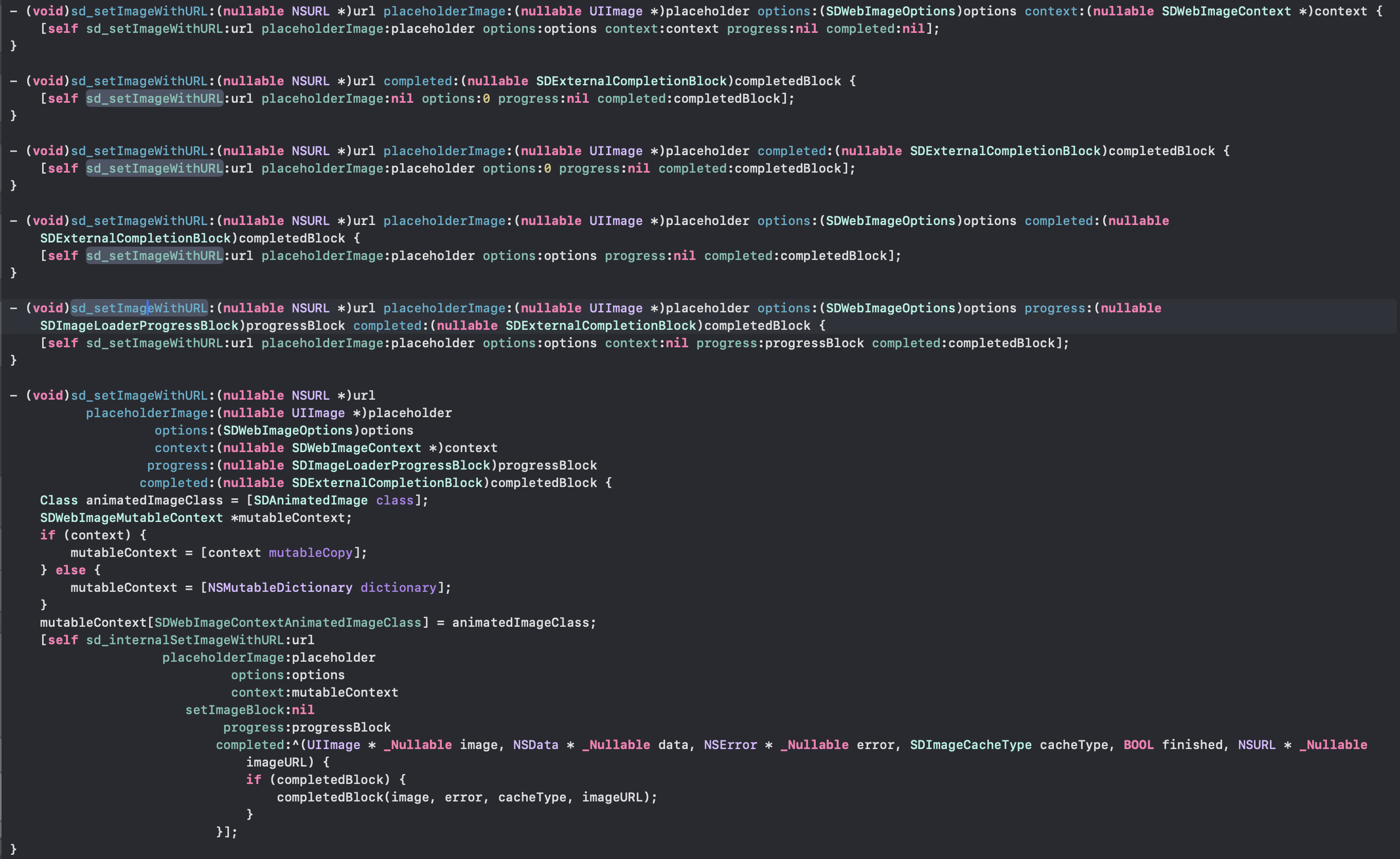 SDWebImage还提供了其他方法, 但是我们通过查看源码发现,最终都是调用气全能方法,全能方法还提供了占位图、可选项、加载进度和完成回调。