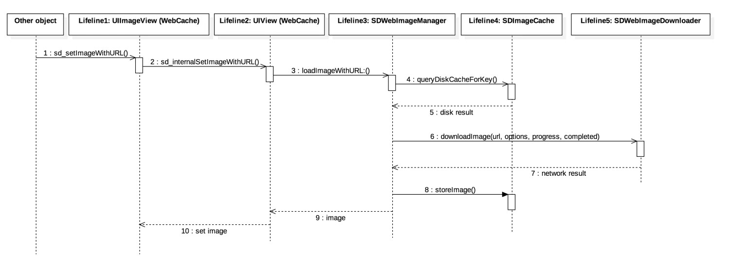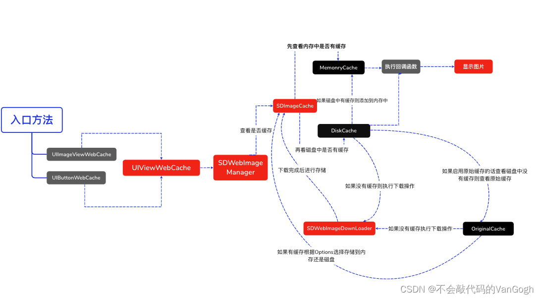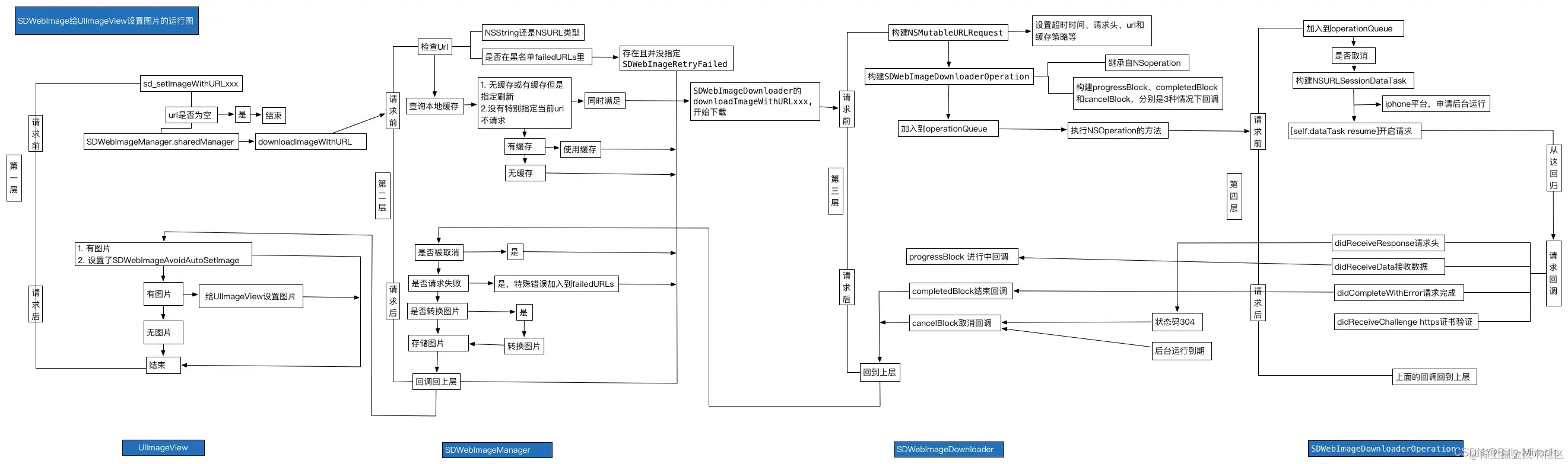 当使用[imageView sd_setImageWithURL:imageUrl placeholderImage:nil];方法时,会执行UIImageView+WebCache类中的相应方法,当使用[button sd_setImageWithURL:imageUrl forState:UIControlStateNormal placeholderImage:nil];方法时会执行UIBUtton+WebCache类中的相应方法,但是最后都会调用UIView+WebCache类中的- (nullable id<SDWebImageOperation>)sd_internalSetImageWithURL:(nullable NSURL *)url placeholderImage:(nullable UIImage *)placeholder options:(SDWebImageOptions)options context:(nullable SDWebImageContext *)context setImageBlock:(nullable SDSetImageBlock)setImageBlock progress:(nullable SDImageLoaderProgressBlock)progressBlock completed:(nullable SDInternalCompletionBlock)completedBlock {};方法。接着根据URL,通过SDWebImageManager的loadImageWithURL:options:context:progress:completed:方法加载图片,接着通过sd_setImageLoadOperation方法将operation加入到SDOperationsDictionary中。然后调用queryCacheOperationForKey方法进行查询图片缓存,通过查询内存和磁盘中是否有缓存,如果有则通过SDImageCacheDelegate回调imageCache:didFindImage:forkey:userInfo到SDWebImageManager,然后其回调webImageManager:didFinishWithImage:到UIImageView + WebCache前短展示页面。