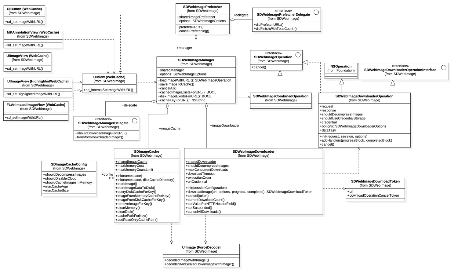 - SDWebImage的大部分工作是由缓存对象SDImageCache和异步下载器管理对象SDWebImageManager来完成的。