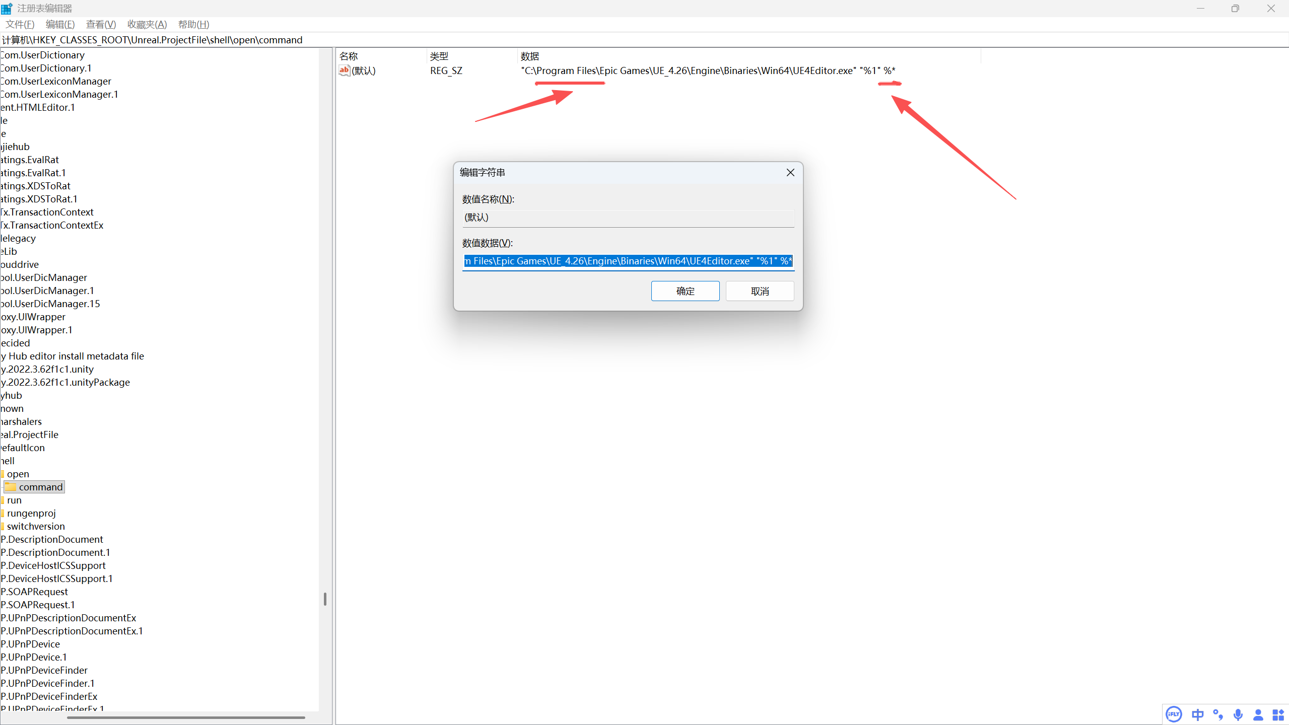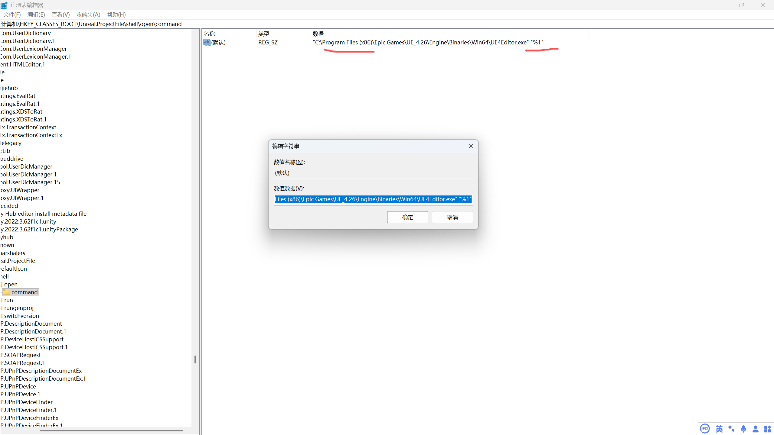 按 Win + R 输入regedit,打开注册表编辑器。导航到该路径下:HKEY_CLASSES_ROOT\Unreal.ProjectFile\shell\open\command