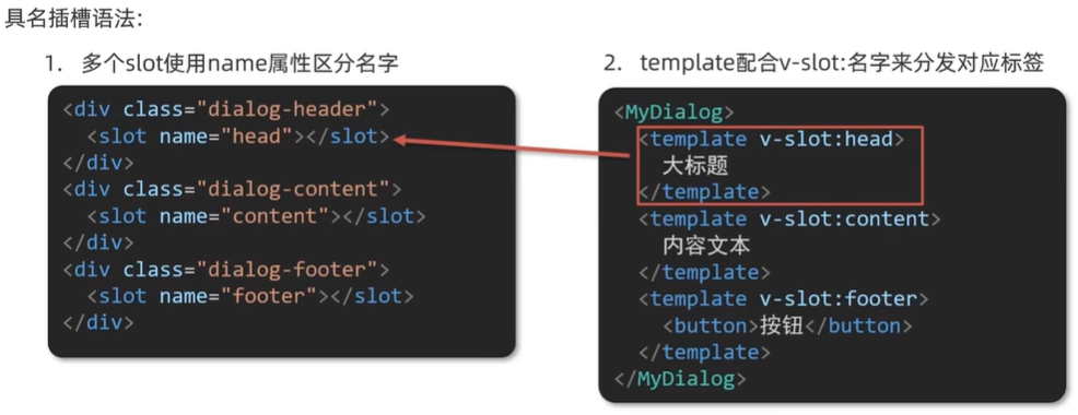 一个组件内有多处结构,需要外部传入标签,进行定制。使用多个slot占位,使用name属性区分。