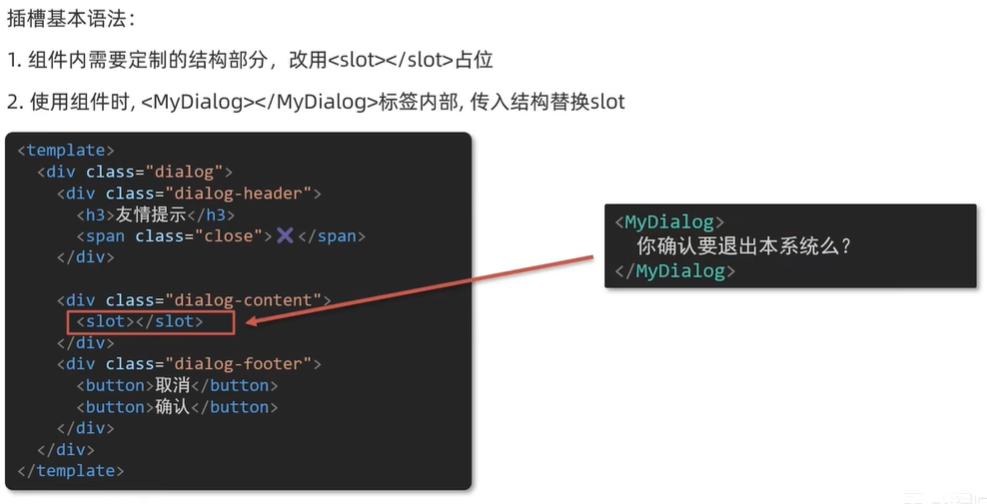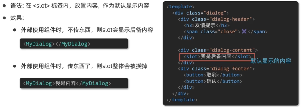 插槽分类:默认插槽(组件内定制一处结构)和具名插槽(组件内定制多处结构)。