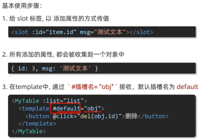 定义slot插槽的同时,是可以传值的。给插槽上可以绑定数据,将来使用组件时可以用。