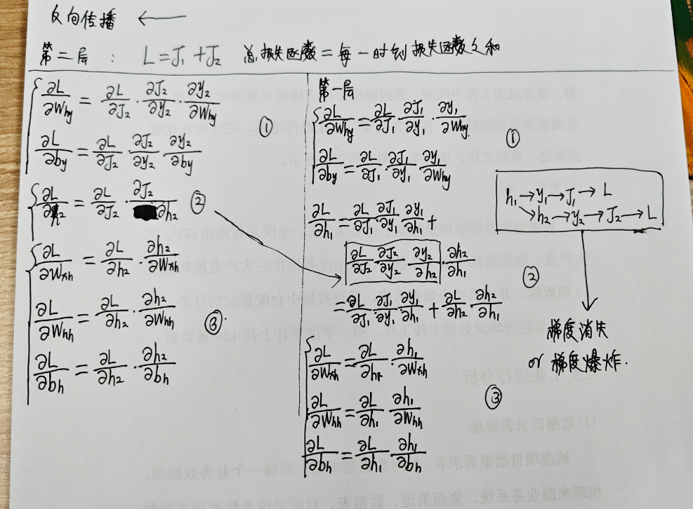 RNN 在所有时刻共享同一套权重((W_{xh})、(W_{hh})、(W_{hy})),而非为每个时刻单独设置参数。例如处理 100 步的序列,RNN 仅需 "输入→隐藏 + 隐藏→隐藏 + 隐藏→输出"3 套权重,而前馈网络需为每个时刻设计独立权重,参数数量呈线性增长。