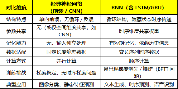 经典神经网络采用单向前馈结构,数据从输入层→隐藏层→输出层单向传递,层与层之间无反馈 / 循环连接;层内参数独立,不同层(或同一层的不同神经元)使用不同权重,无参数共享;每次输入的处理相互独立,无法利用历史信息。而循环神经网络RNN采用循环结构,隐藏层的输出不仅传递给输出层,还会反馈给自身作为下一时刻的输入,形成 "循环";所有时刻共用同一套权重;且有短期记忆能力,通过隐藏状态(h_t)累积历史信息,当前输出依赖 "当前输入 + 历史记忆"。经典神经网络与RNN的核心对比见下图: