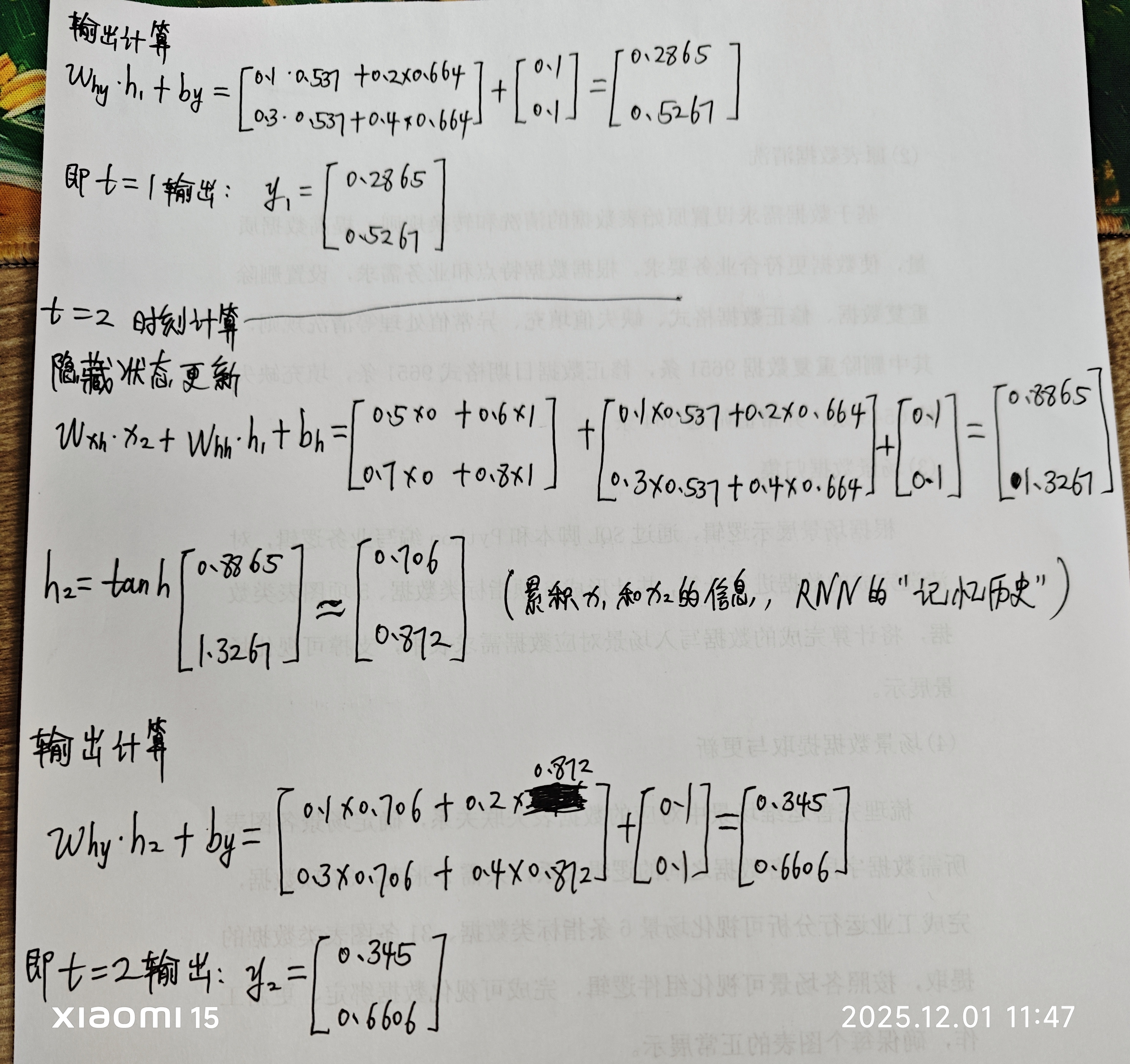RNN(Recurrent Neural Network,循环神经网络)是专为序列数据(如文本、时间序列、语音)设计的神经网络,核心解决传统前馈神经网络无法捕捉 "时序依赖""变长序列" 的问题,通过 "循环传递隐藏状态" 实现对序列历史信息的记忆,也是理解LSTM以及Transformer模型的一个基础模型。下面关于RNN的基础架构 Vanilla RNN进行理论介绍以及实例计算推导,帮助"模糊"的人更清晰理解一下。