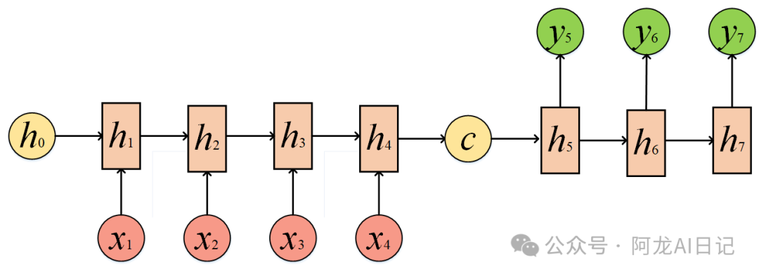 N to M要复杂一些:这种结构也是Encoder-Decoder模型,也可以称之为Seq2Seq模型。在真实的环境中,我们处理的输入和输出的长度往往是不同的,比如翻译问题,源语言和目标语言的句子往往并没有相同的长度。所以,Encoder-Decoder结构先将输入数据编码成一个上下文向量c,拿到c之后,就用另一个RNN网络对其进行解码,这部分RNN网络被称为Decoder。具体做法就是将c当做之前的初始状态h0输入到Decoder中: