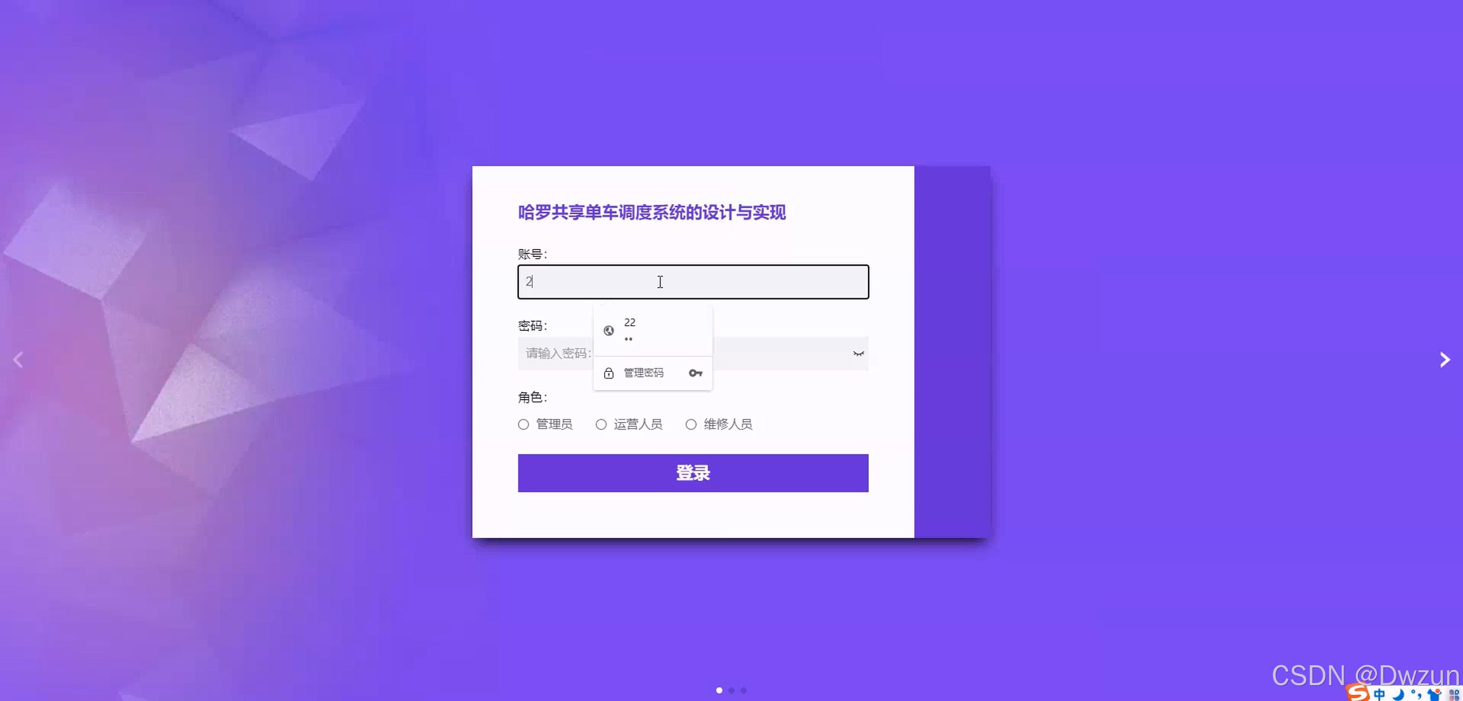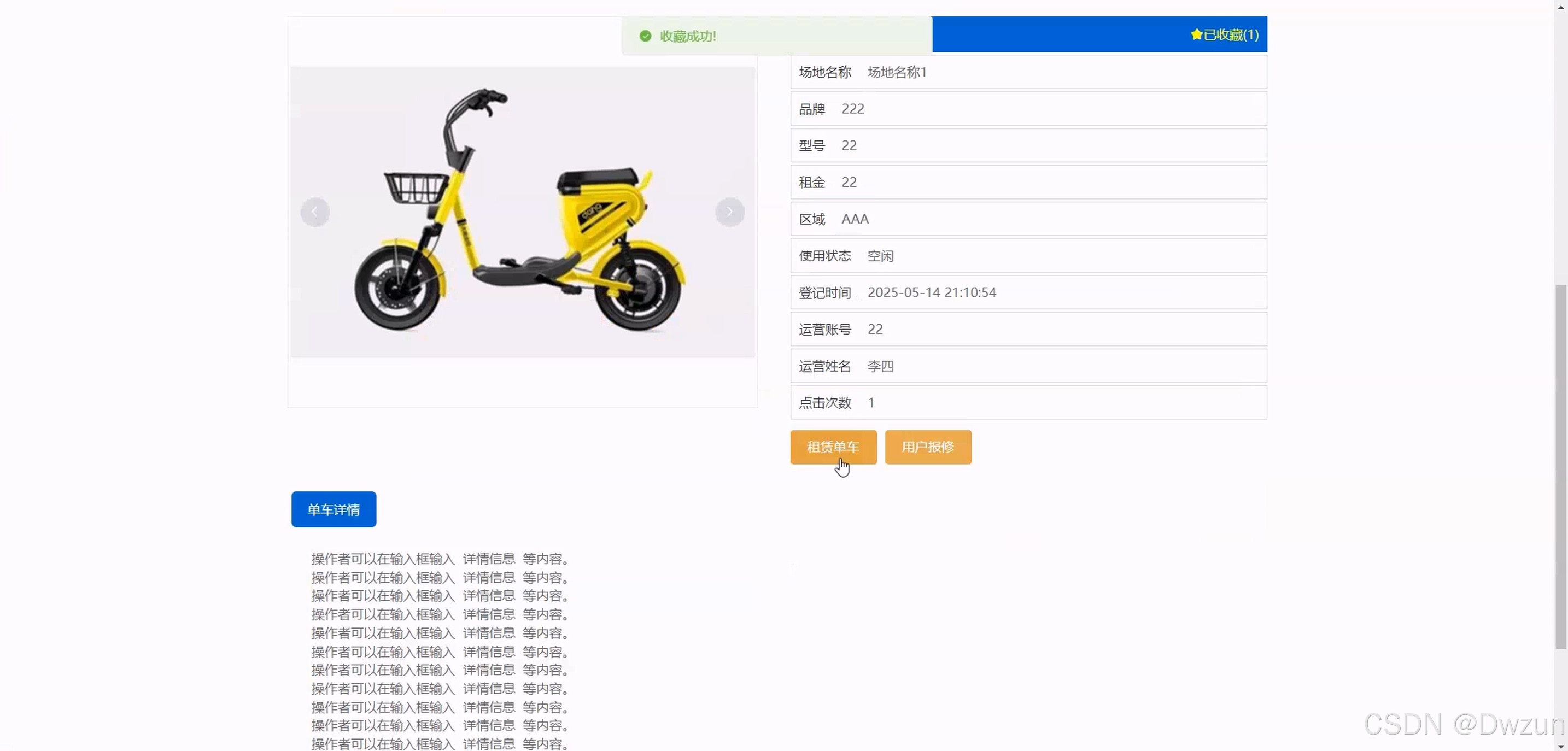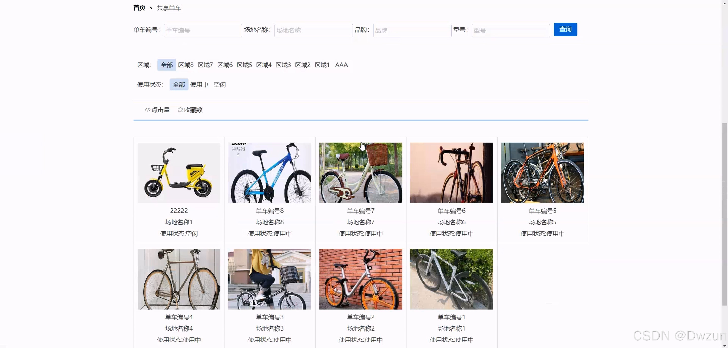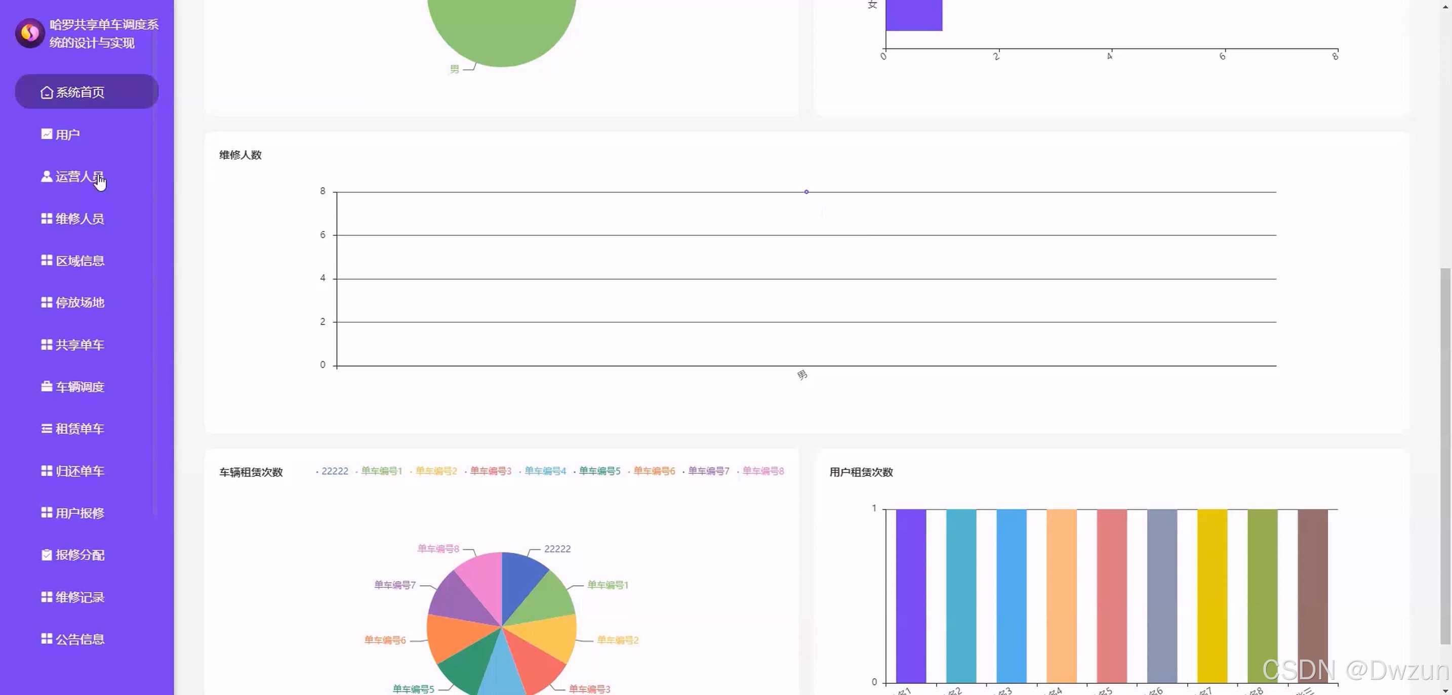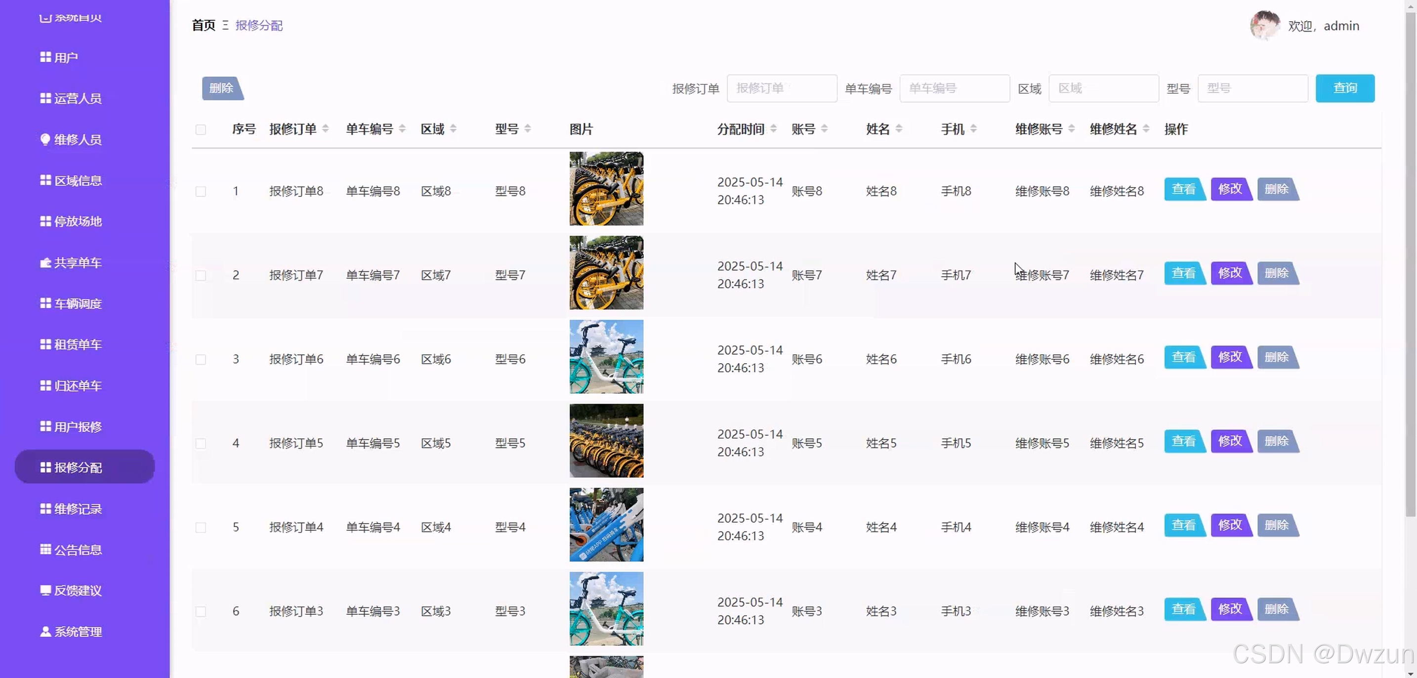 后台管理员模块 全流程管理功能:系统首页、用户管理、运营 / 维修人员管理、区域信息管理、停放场地管理、共享单车管理、车辆调度管理、租赁 / 归还单车管理、用户报修管理、报修分配 / 维修记录管理、公告信息管理 该系统聚焦共享单车的调度与运维场景,通过前台用户实现单车租还与反馈,后台维修人员处理故障维修,运营人员负责车辆调度,管理员统筹全系统资源,实现共享单车从用户使用到后台运维的全流程数字化管理,提升车辆运营效率与用户体验。