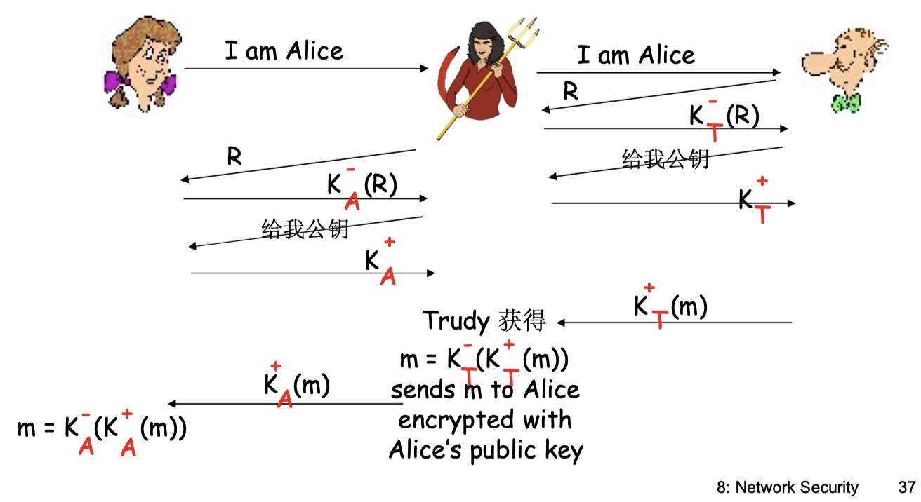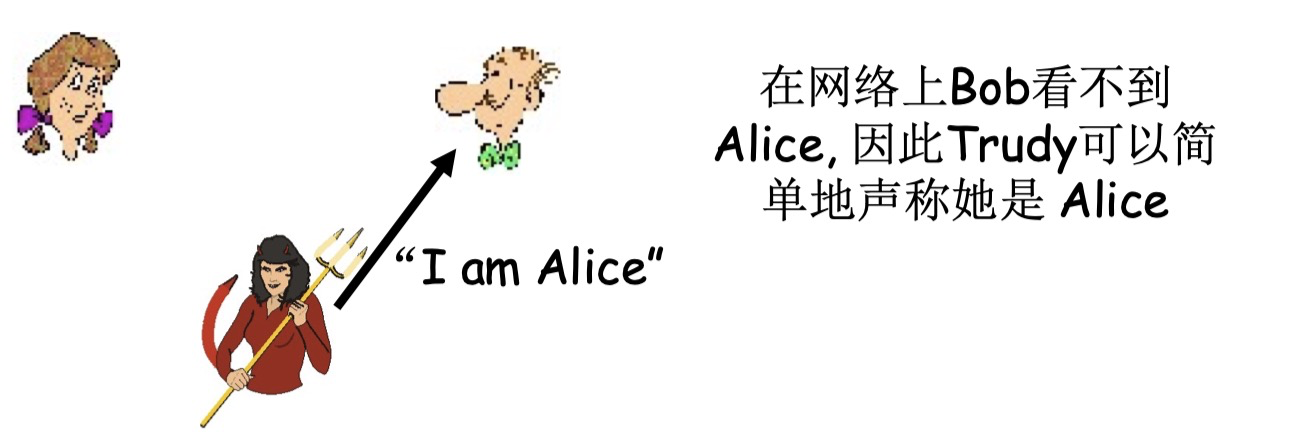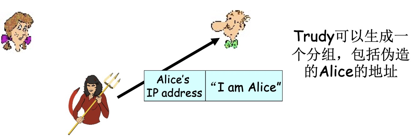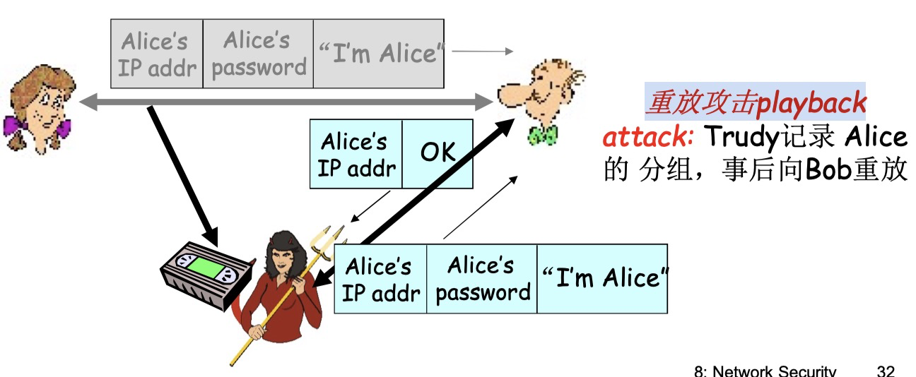 c.alice说 "i am alice", 在她发送的ip数据包中包括了她的密码, 而且传送她的密码来证明