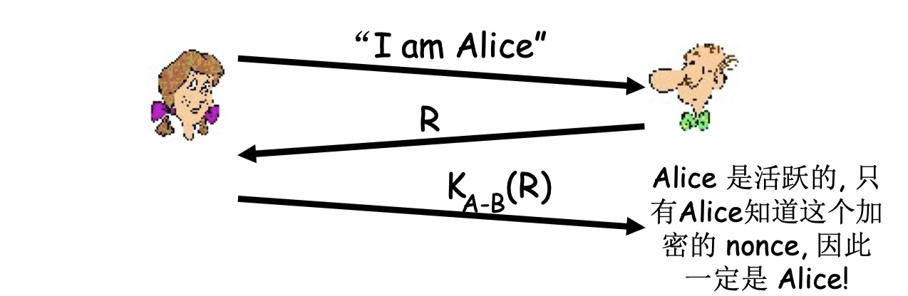 为了证明alice的活跃性, bob发送给alice一个nonce, alice必须返回加密之后的R, 使用双方约定好的key对R进行加密