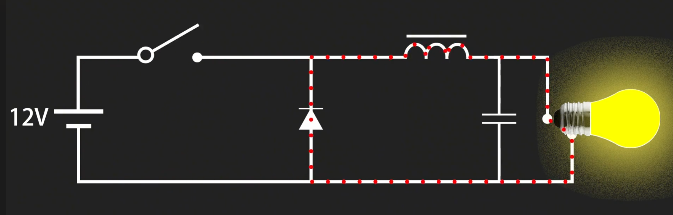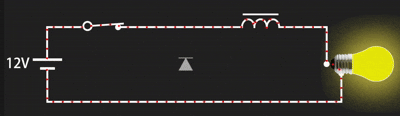 3.如果在电路中再加入一个二极管,在闭合开关时,二极管是反向截止状态,断开开关后,电流依然形成了回路(如图,红色点表示流动的电子),并且电流逐渐减小。