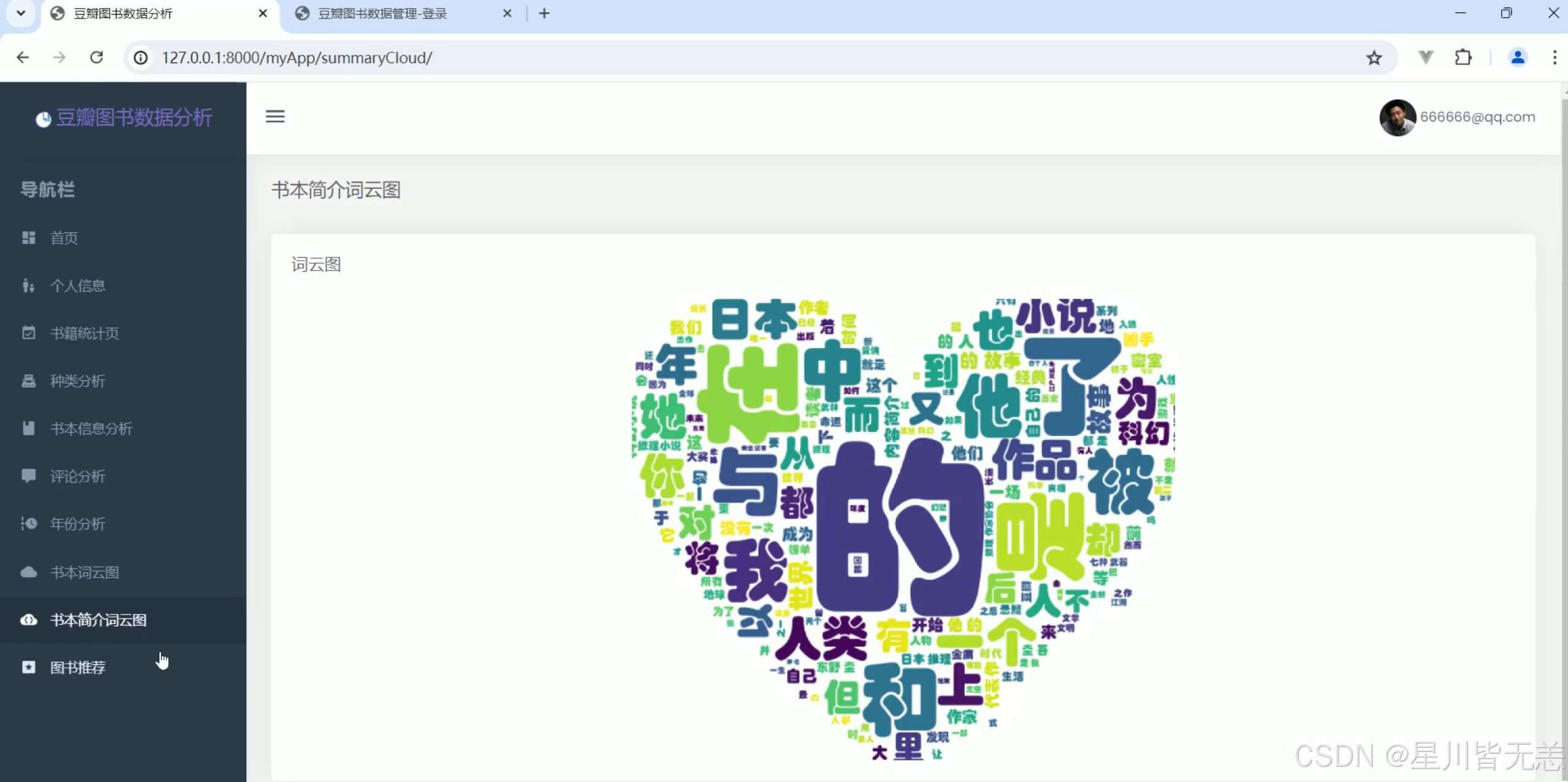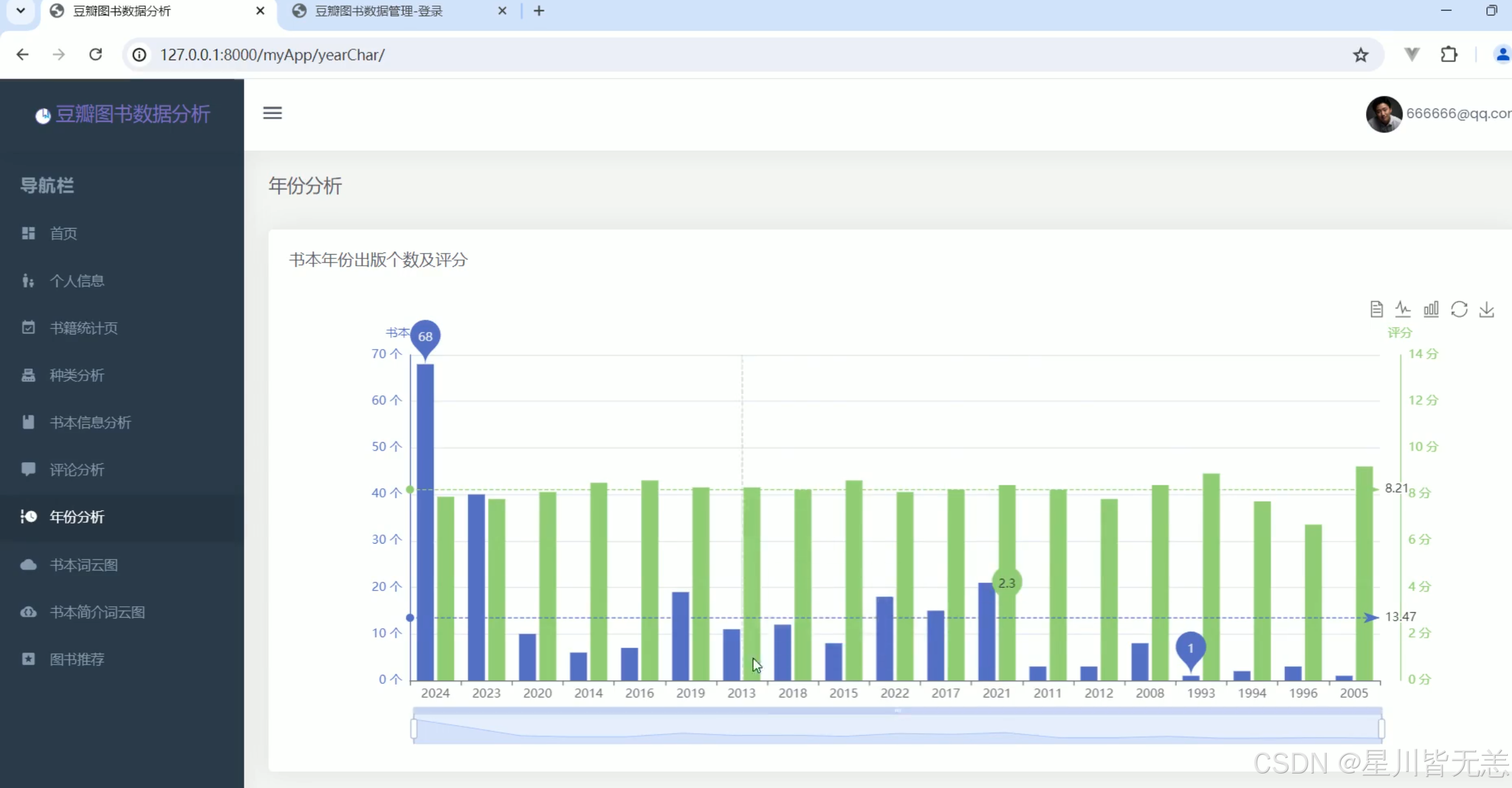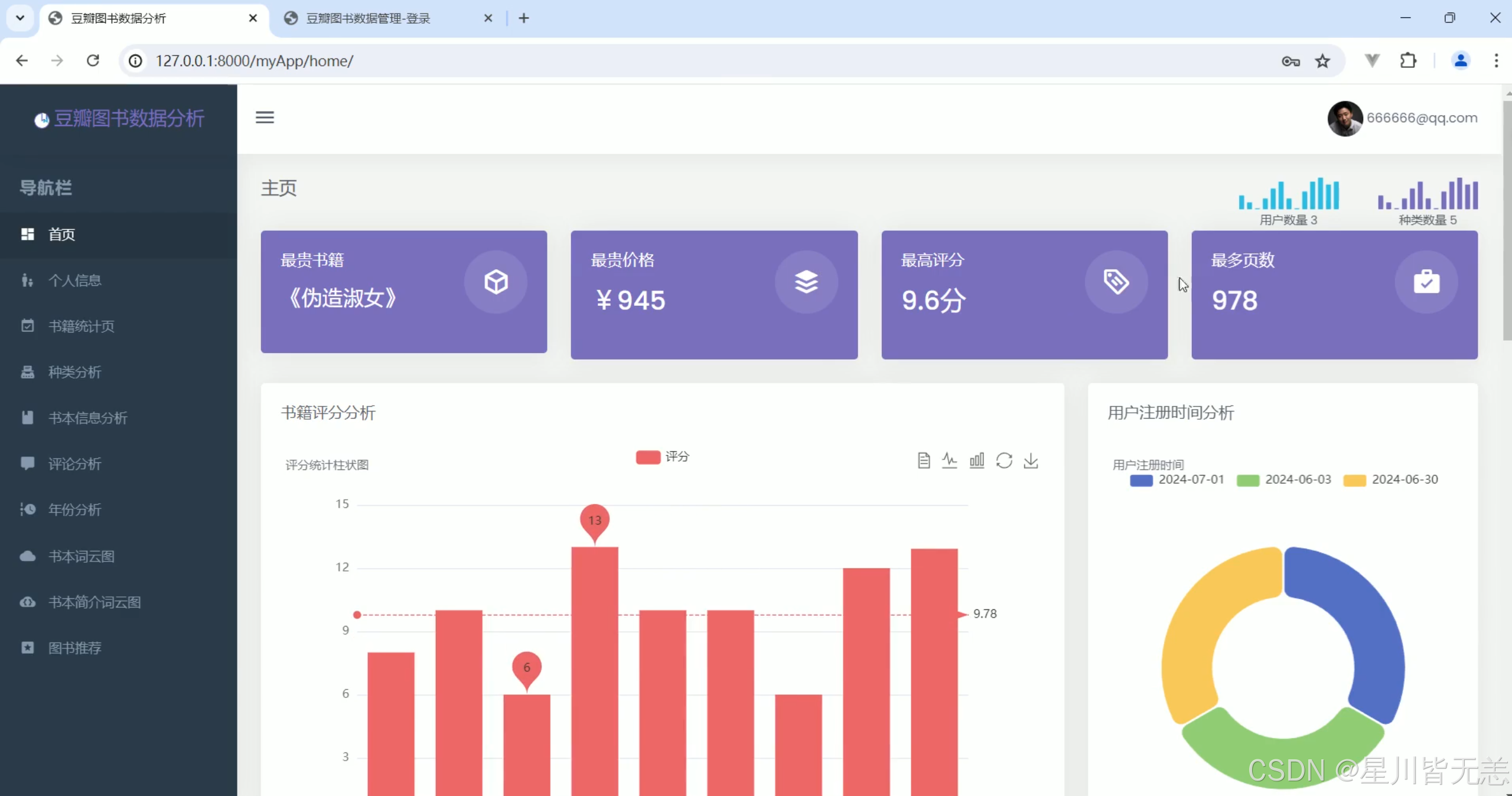 当前,随着信息技术的飞速发展,尤其是大数据和人工智能技术的应用,数据分析和可视化逐渐成为各行各业的重要工具。近年来,图书作为文化传播和知识共享的重要载体,受到了广泛关注。豆瓣作为国内领先的社交平台之一,拥有庞大的用户群体及丰富的图书数据。平台上的用户评论、评分以及图书信息等数据不仅为用户提供了参考,也为学术研究、图书推荐系统以及出版行业的决策提供了宝贵资源。然而,由于豆瓣图书数据量庞大且复杂,如何从中提取有价值的信息,并通过合适的方式进行展示和分析,成为一个值得研究和探索的问题。